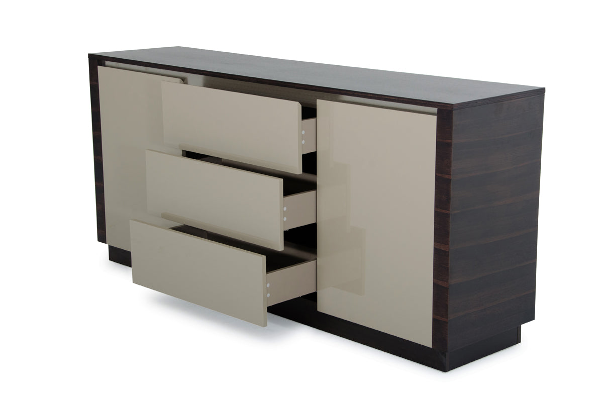 The A&X Caligari Modern Oak & Grey Gloss Buffet is packed with style and function featuring a lustrous Oak veneer and grey gloss finish. It is fitted with two 2-door cabinets with 2 inside shelves and 3 spacious soft-closing drawers. This modern buffet has a dimension of W72" x D18" x H33" and requires no assembly.