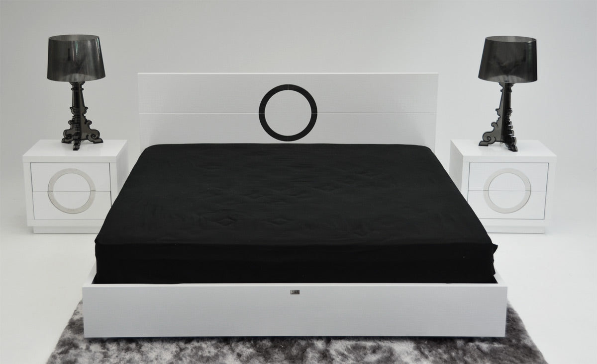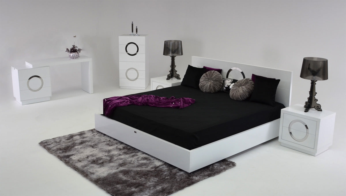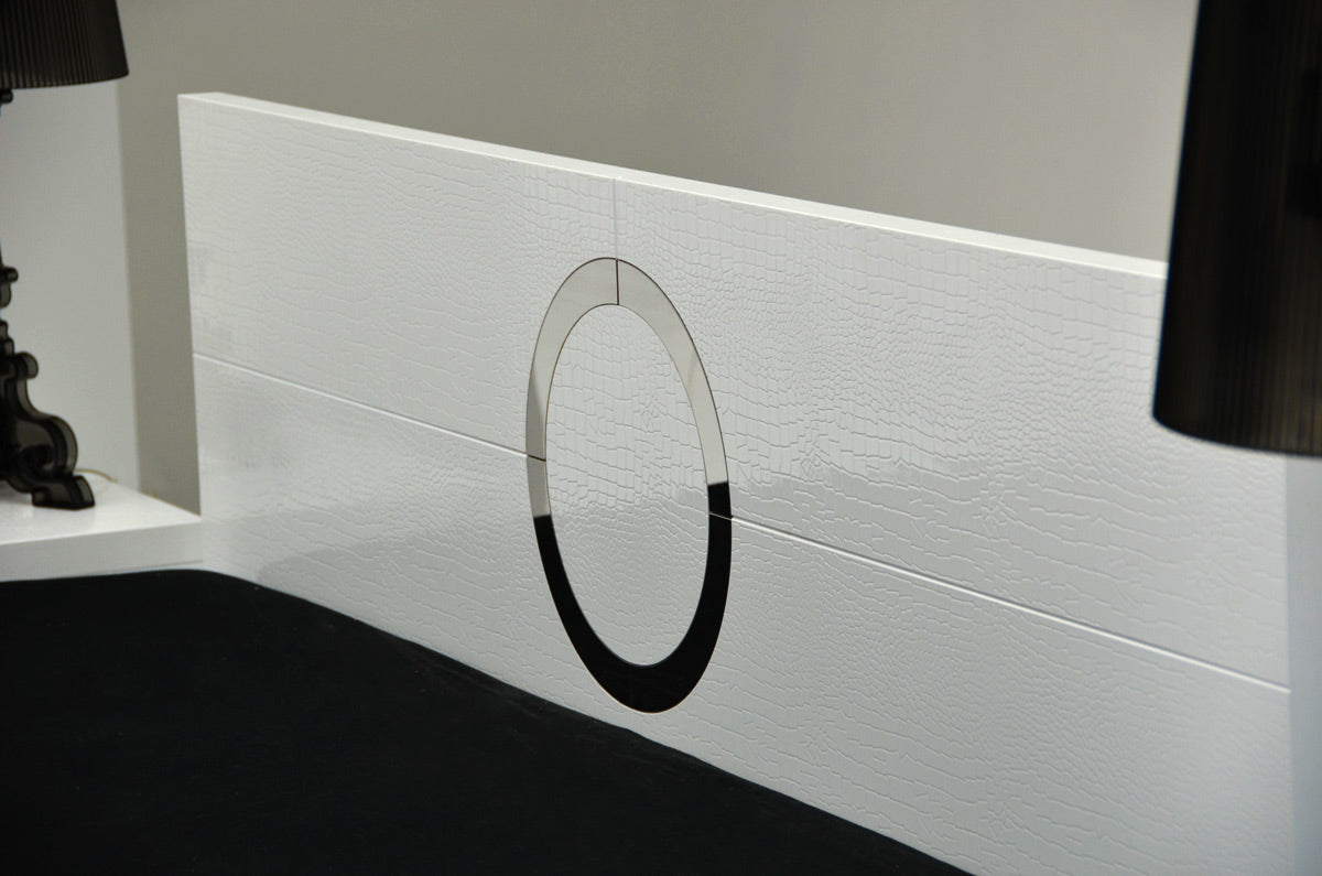 The Ovidius modern lacquer bed AW223-180 features a modern and dainty reflective circular accent on the headboard that blended pleasantly with the white glossy crocodile lacquer that covers the whole length of the bed. Its clean and straight lines stood out with the simplicity of its design and white color, a direct statement of modernism.