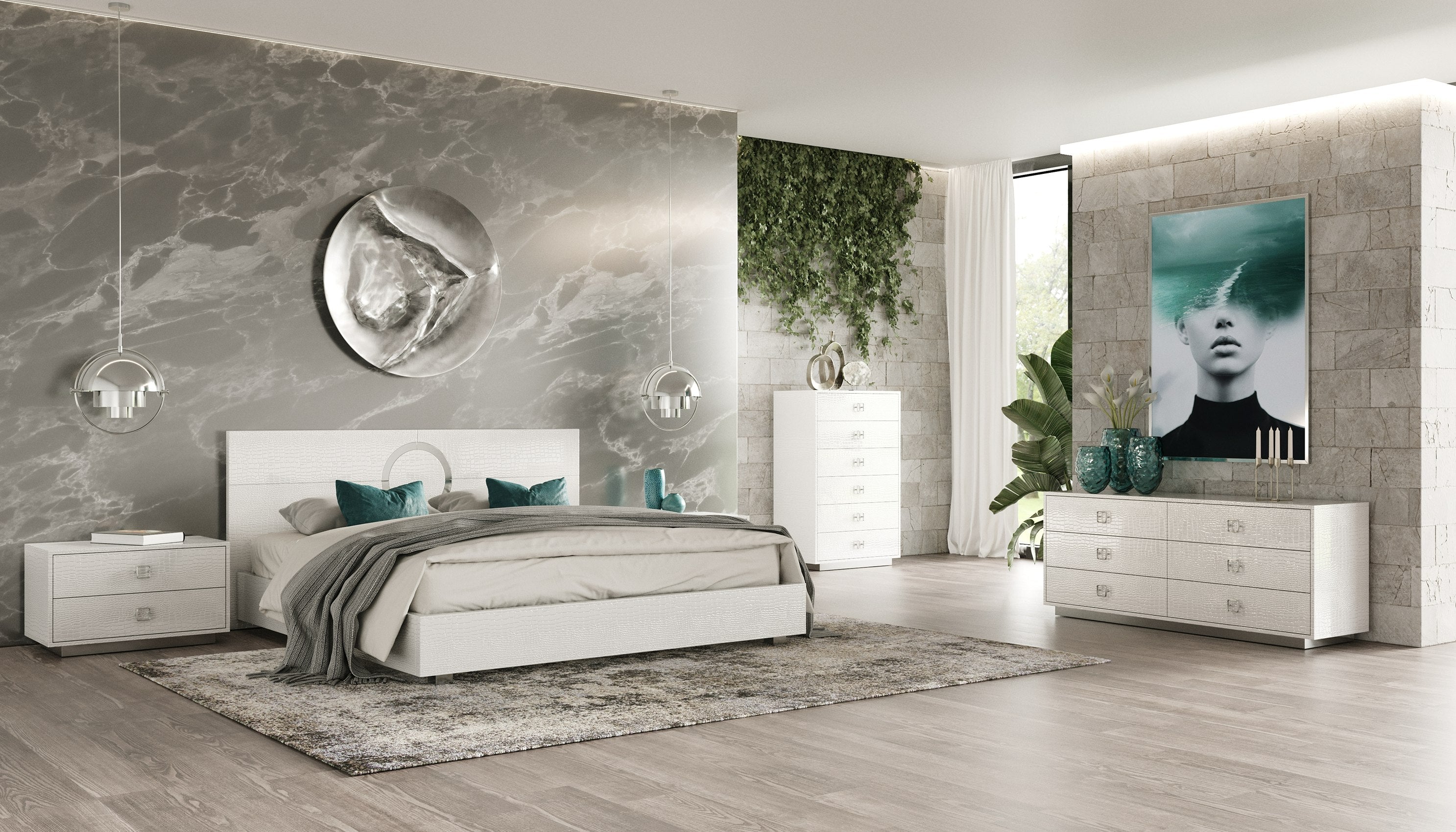 - White glossy laser-etched crocodile lacquer embossed bedroom furniture