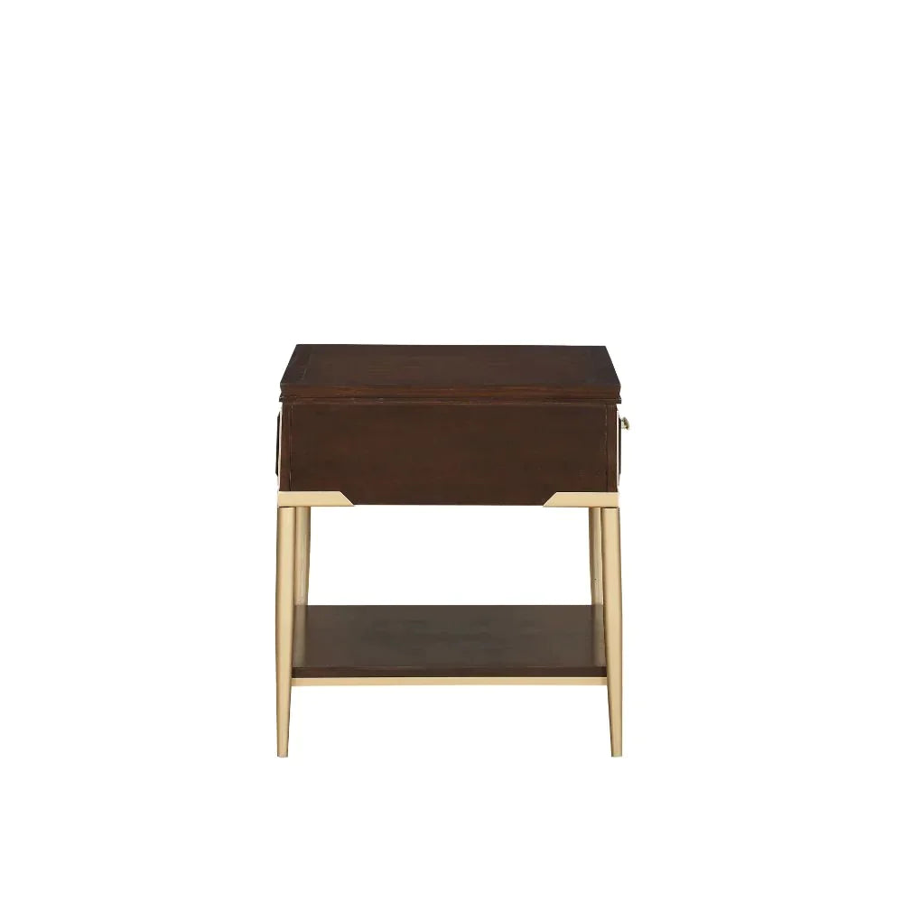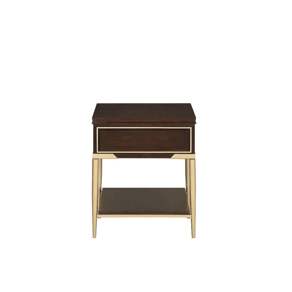 Rectangular Leg End Table Storage: 1 Drw, Open Compartment (1 Wooden Shelf) CONSTRUCTION Wooden Top Drawer & Shelf: Wood Veneer, Pine Wood Metal Tapered Leg & Trim: Gold finish Drawer: GLIDE Side Metal (Full Ext.), Felt-Lined, Self Close, Hardware: Single Handle, Gold Finish