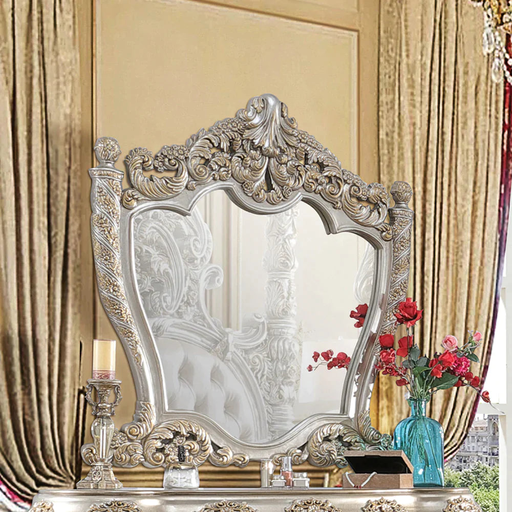 Fixed Table Top Legs & Pedestal Table Hollow Carving Design Padded Seat Cushion Nailhead Trim Curio w/Touch Light Curved Drawer Top