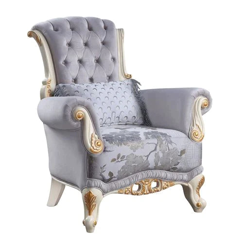 Product Feature: Seat Construction: Pocket Coil Wooden Inner Frame Loose Seat & Tight Back Cushion Accent Pillows Included Sloping Armrest Button Tufted Gold Trim Accent