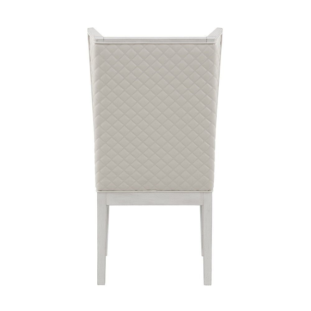 These Katia side chairs strike a balance between casual and chic. The weathered white finish is a classic combination that will go with all decor styles. These side chairs feature a weathered white wooden frame, with a classic wingback backrest design. The seat and backrest are padded with foam and upholstered in gray linen, while the outer side of the backrest is upholstered in synthetic leather. These side chairs will help create a welcoming feel to your dining room where you will be hosting guests and making memories for years to come. Sold as a set of two chairs.