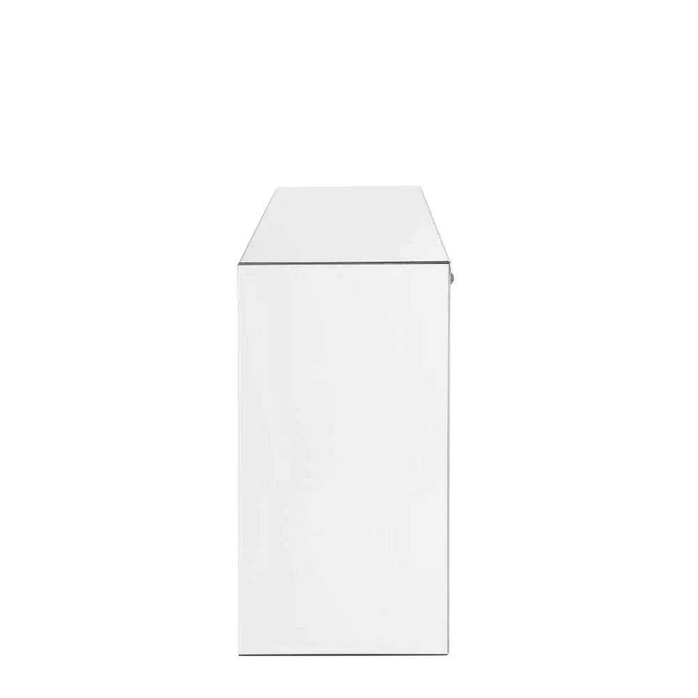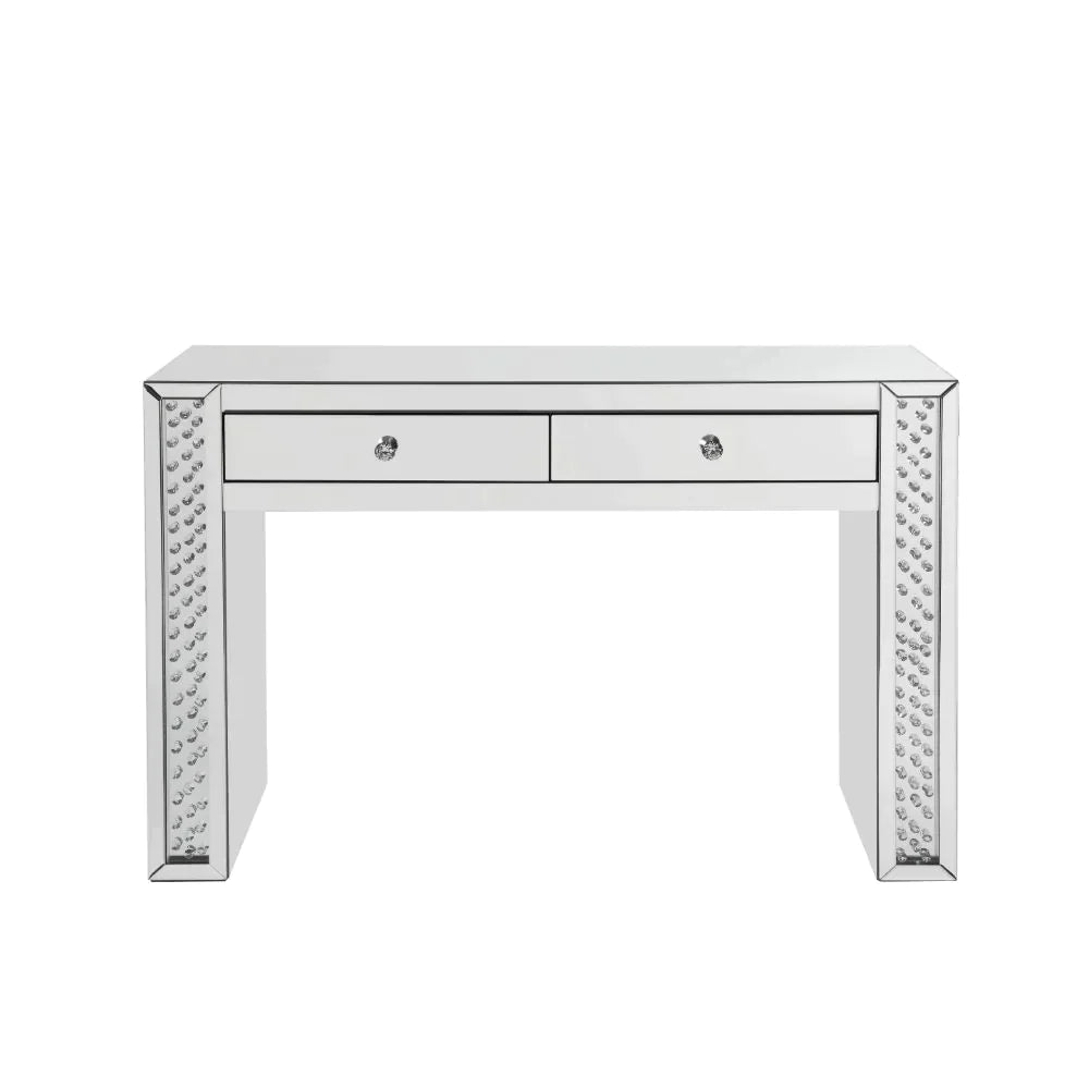 Assambled, Rectangular Vanity Desk Storage: 2 Top Drw (Open Base) Beveled Mirrored Finish, Clear Glass with Faux Crystal Inlay (Back Unfinished) Orientation: Free Standing CONSTRUCTION Mirrored Top & Drw: Beveled Mirror, MDF (NO Apron) Mirrored Sled Base: Beveled Mirror, Faux Crystal Inlay & 4mm Clear Tempered Glass, MDF Drawer: GLIDE Side Metal (2/3 Ext.), Dovetail French Front, Full Black Finish Inside (Felt NOT Included), Safety Stop Included, Manual Close, Hardware: Single Knob