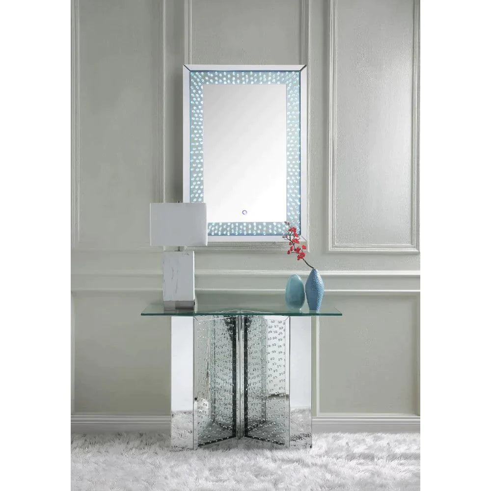 Features: Glass Top, Mirrored "V" Shape Base w/Faux Crystals & Clear Glass