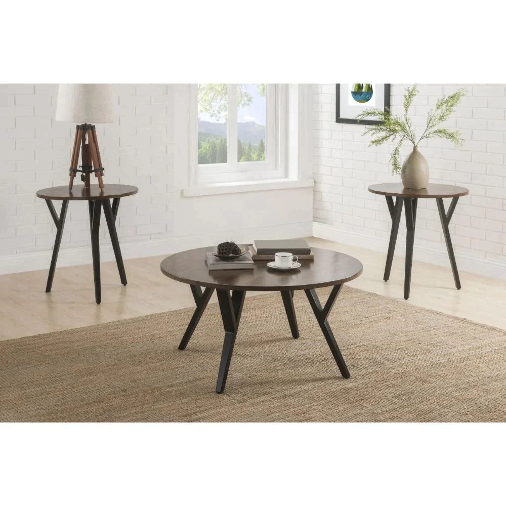 3Pc Pack C/E Table Set NO Storage (Open Base) Round Wood Top: Oak Finish, Wood Veneer, Thick: 18mm (Fixed Top/No Apron) Metal Tapered Leg: Black Finish, Metal Steel Tube, 25 x 50 x 1.0mm