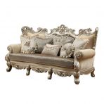 With luxurious styling and comfort with pocket coil seat cushions, the Ranita sofa is grand in looks and feel, with a high wrap around back with oversized carved back detail. This attention to detail in the solid wood ornate and pierced carving surrounds a tight back and loose seat back cushions consisting of pillows. The arms are gracefully rolled with and have nicely shaped face arm posts set upon skillfully carved cabriole legs and supported by a complimenting apron. The plush fabric is tailored to follow the shapes of the wood accents and finished off with nailhead trim.