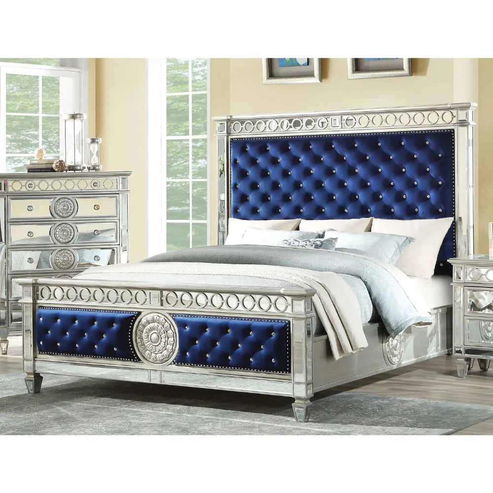 Padded HB/FB: Crystal like Button Tufted, Blue Velvet (Solid Pattern)