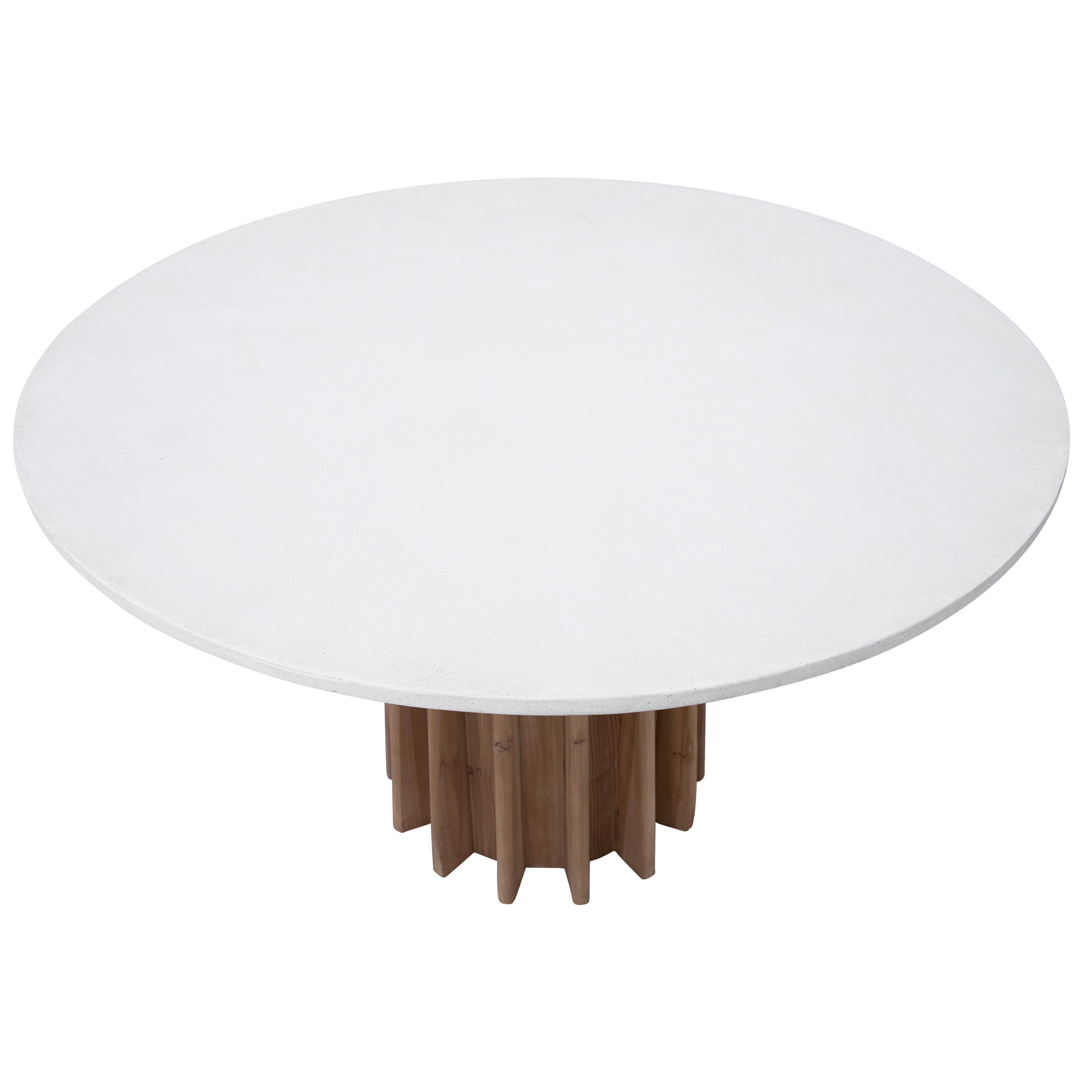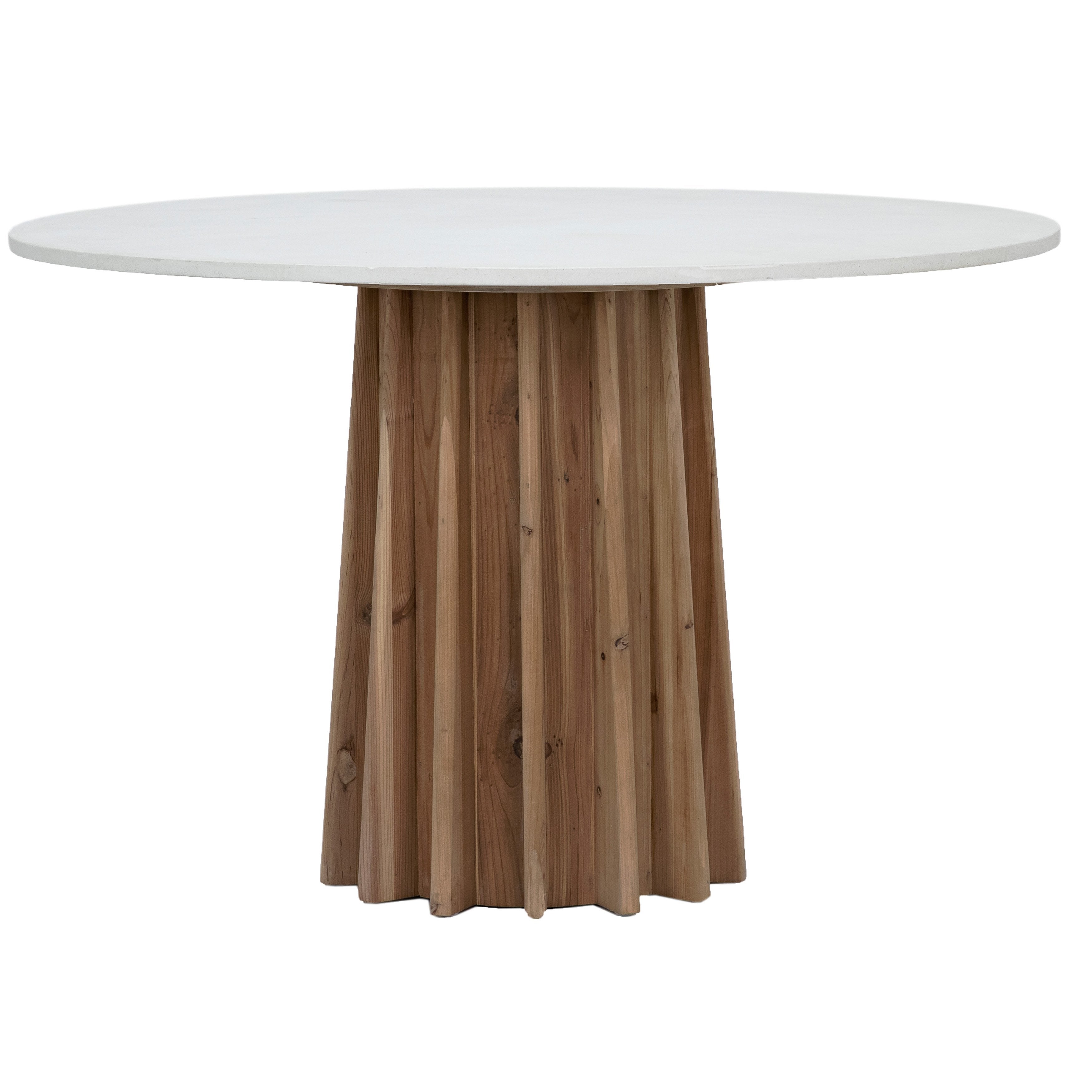 A fun approach to a classic dining table. Featuring a modern fluted base with a natural brushed pine wood finish and a smooth, white concrete 47 round tabletop. The mix of materials gives a beautiful contrast and sets the tone for your dining room or kitchen breakfast nook.