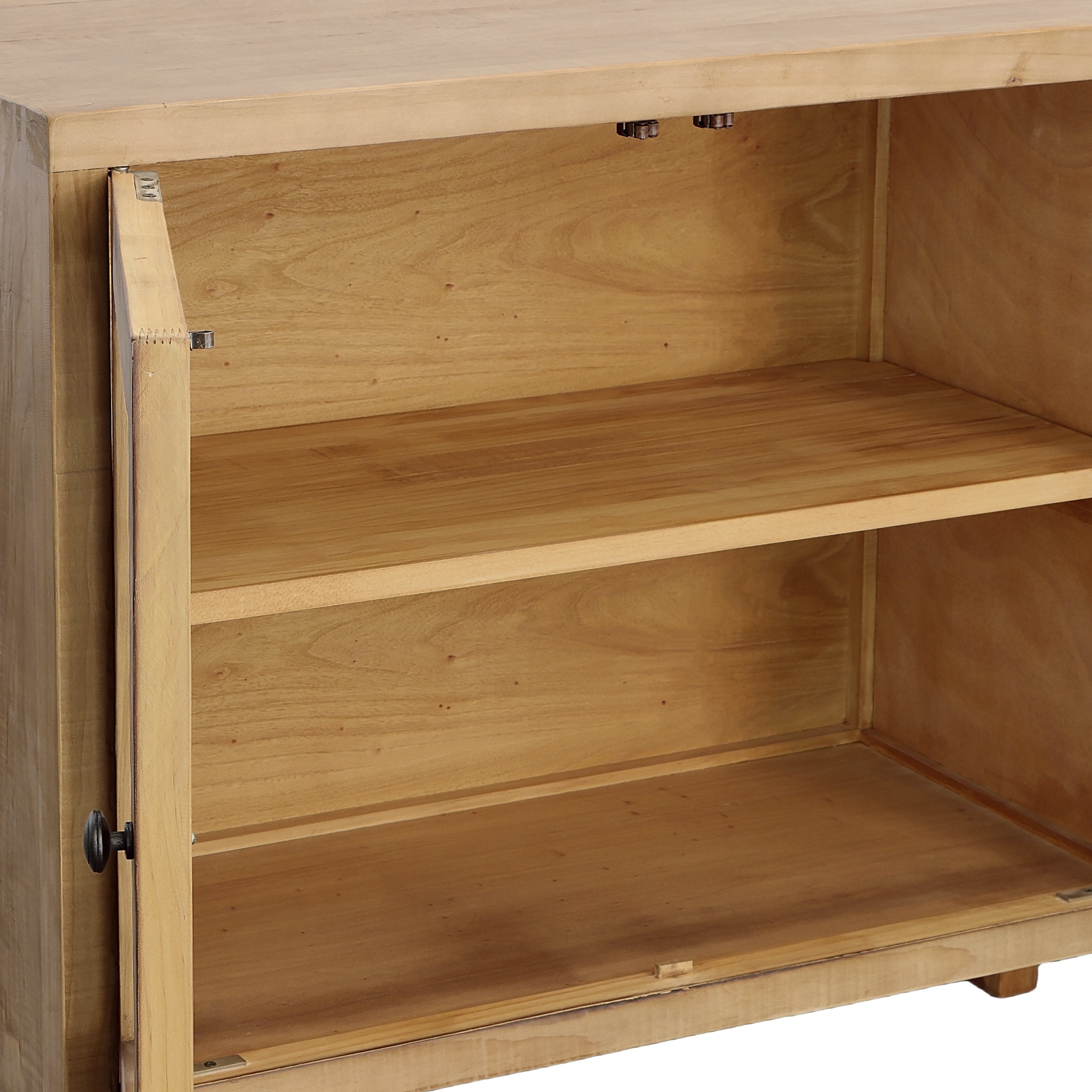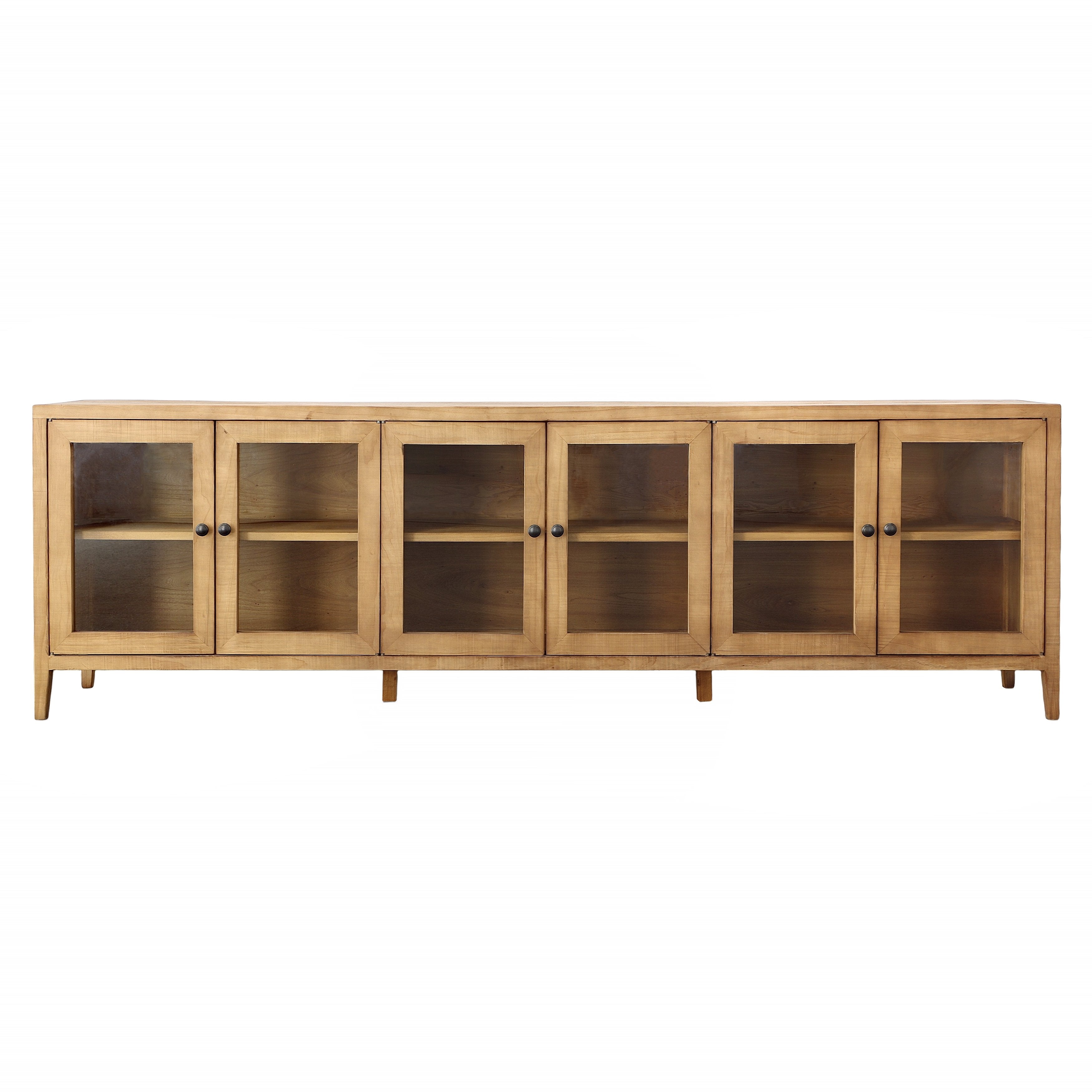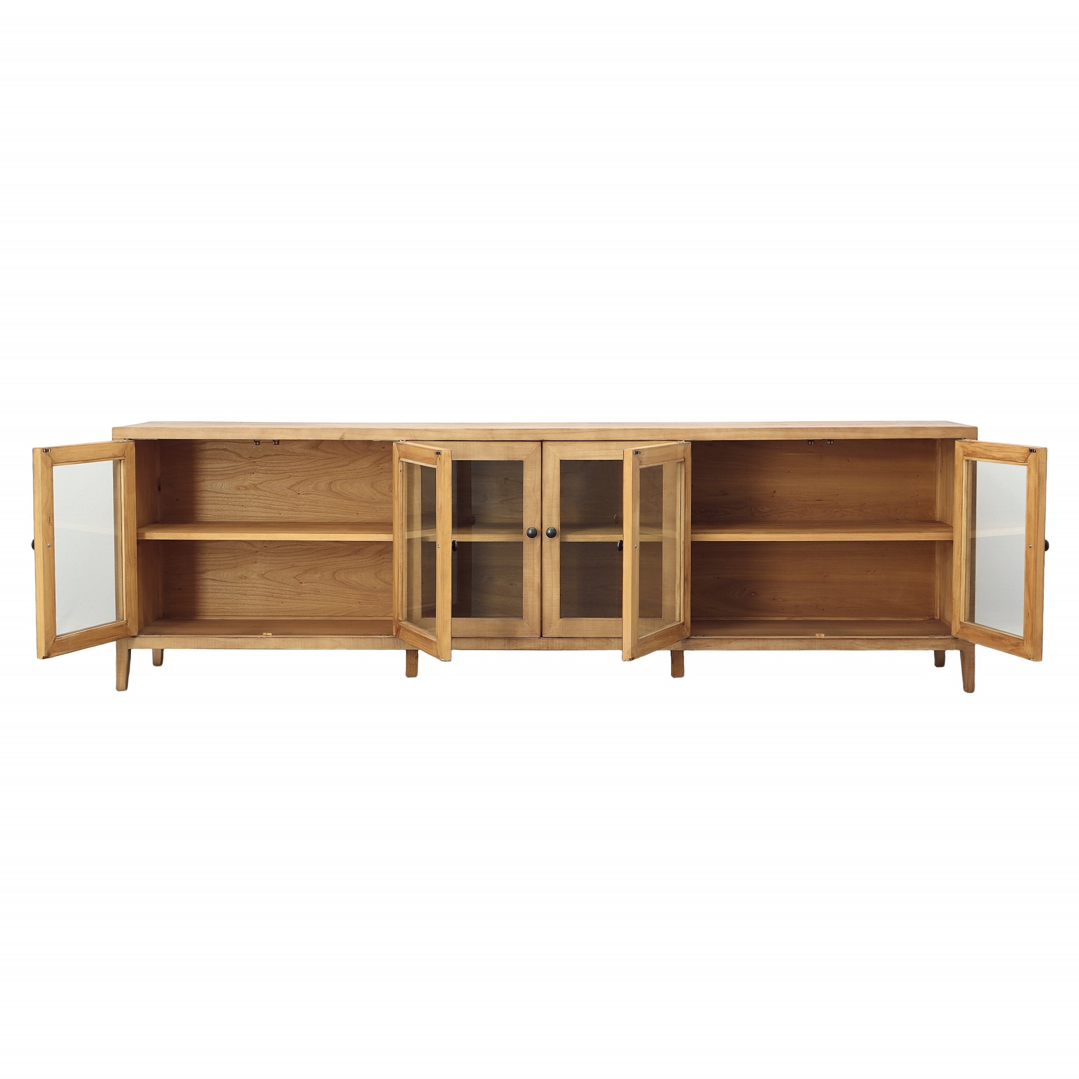 Brining in a fresh, contemporary style to your living space and offering plenty of storage space. The Agno sideboard is an iconic classic of home décor, offering an updated take on a traditional sideboard table. Made from reclaimed pine wood, featuring a beautiful natural finish with open front glass doors to maximize your storage and display options.