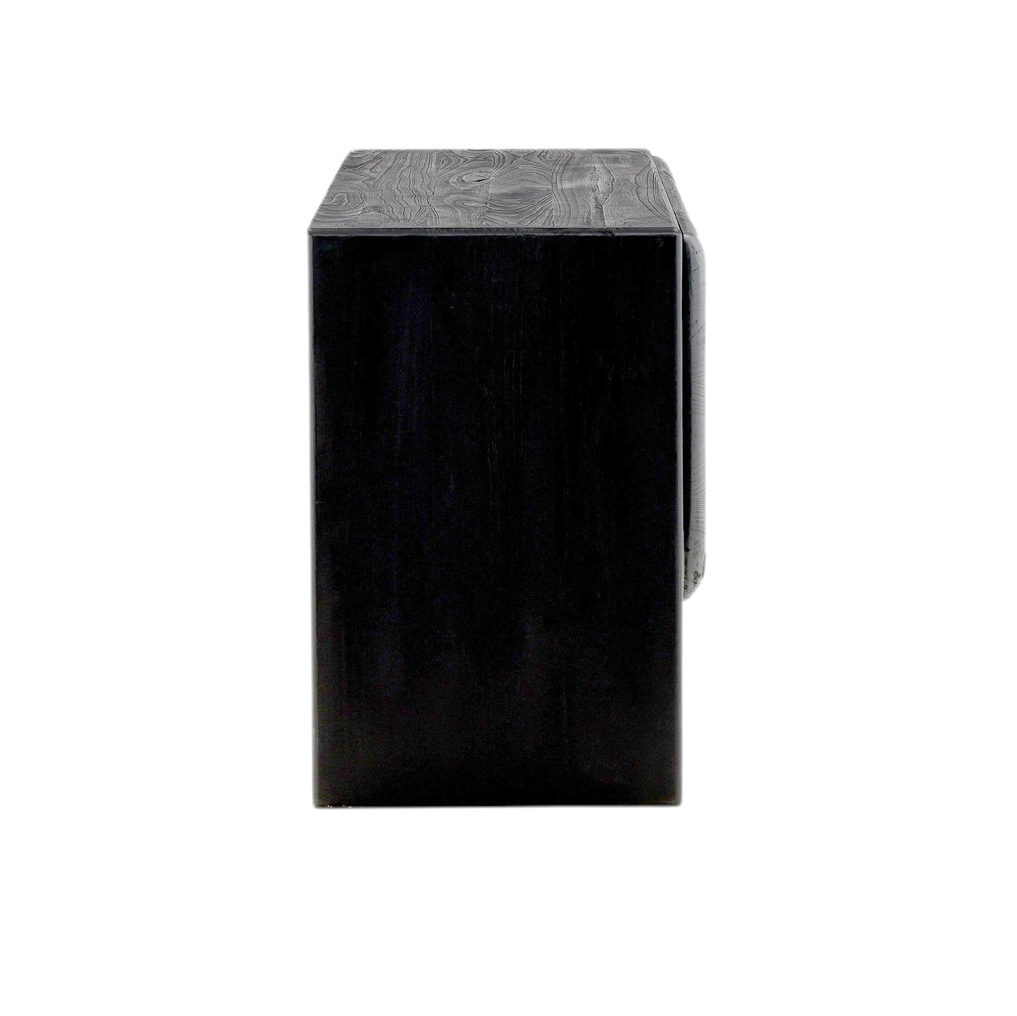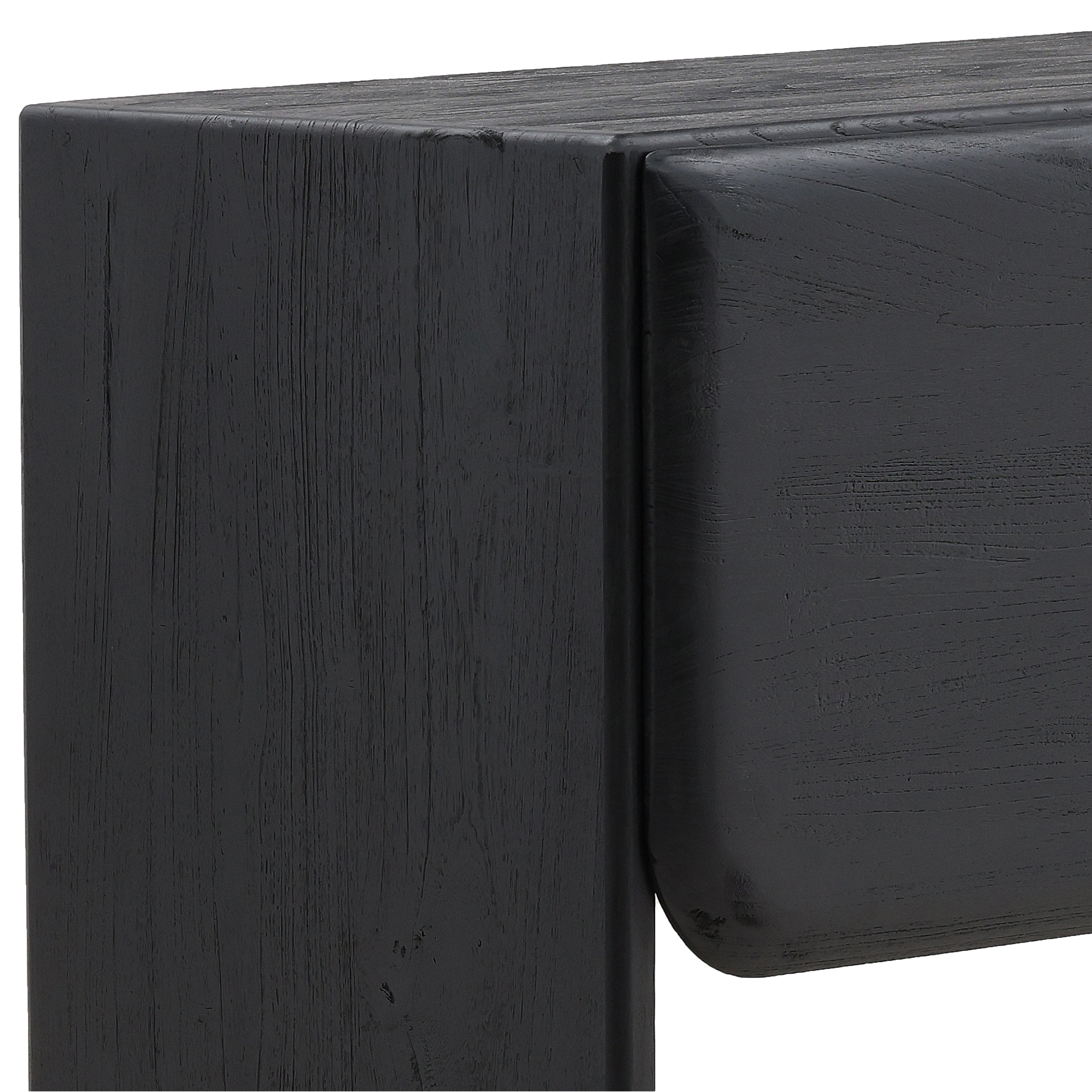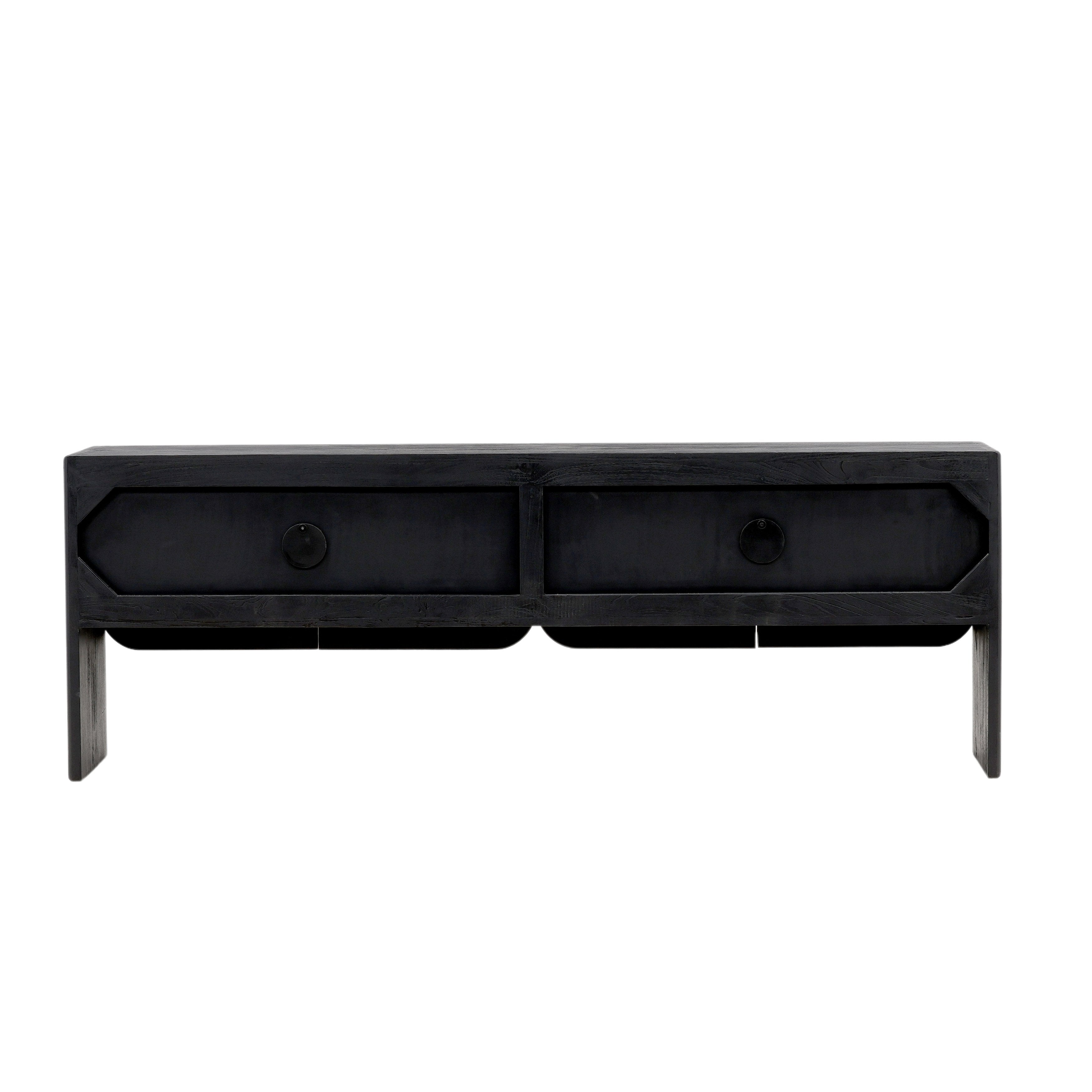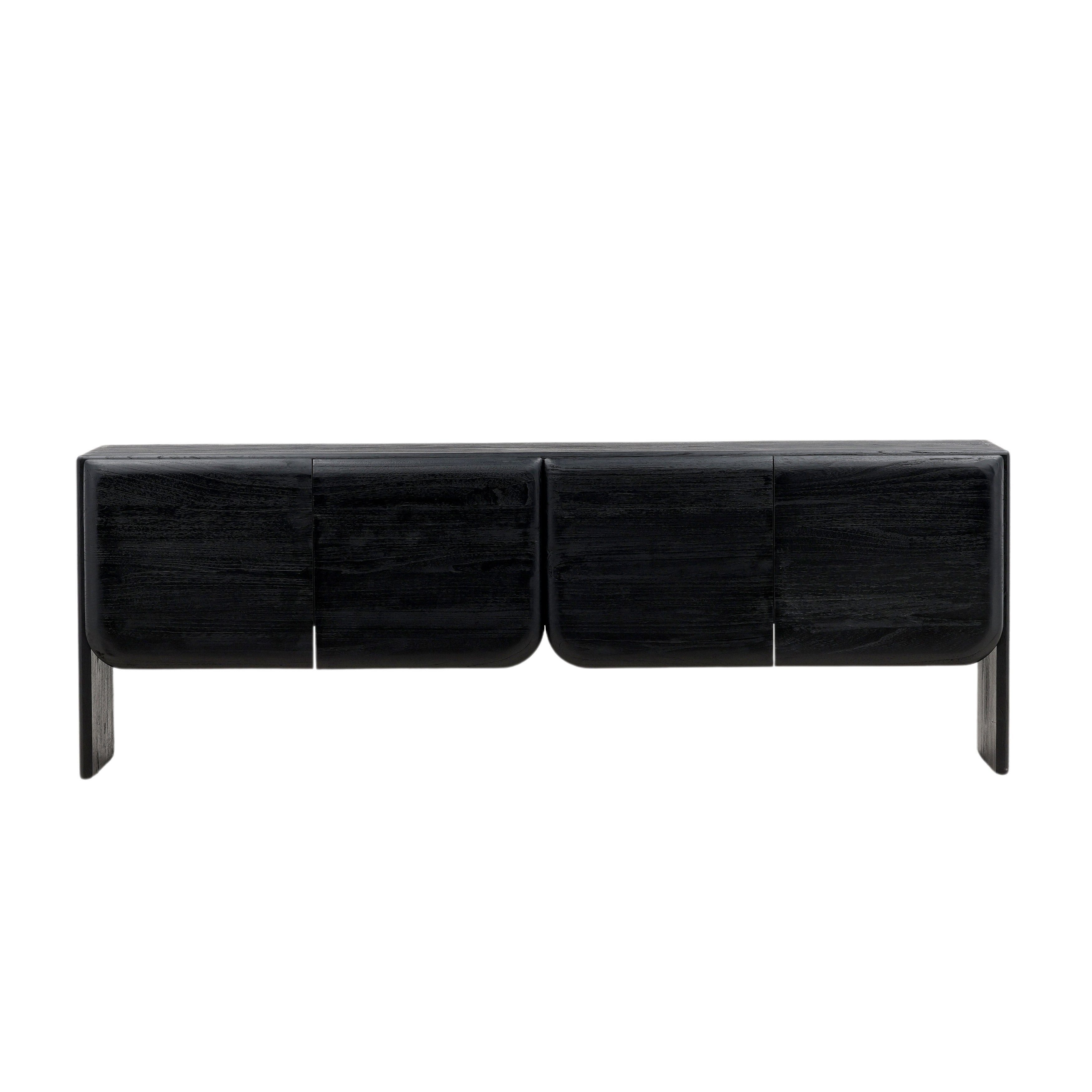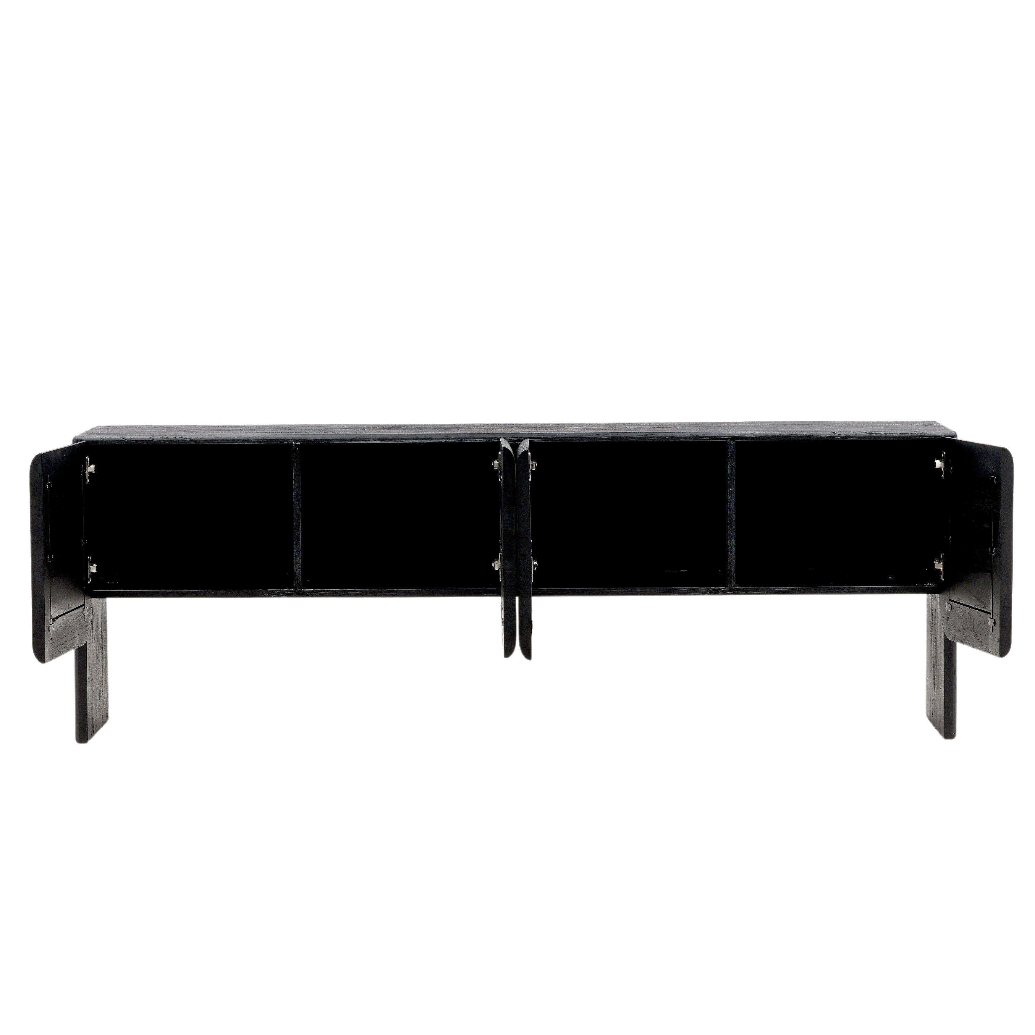 This handcrafted black sideboard, made from mindi and bayor wood, showcases a modern design with two sets of round-edged doors, offering open storage space and two wire management holes for convenience. A practical solution for your storage needs.?