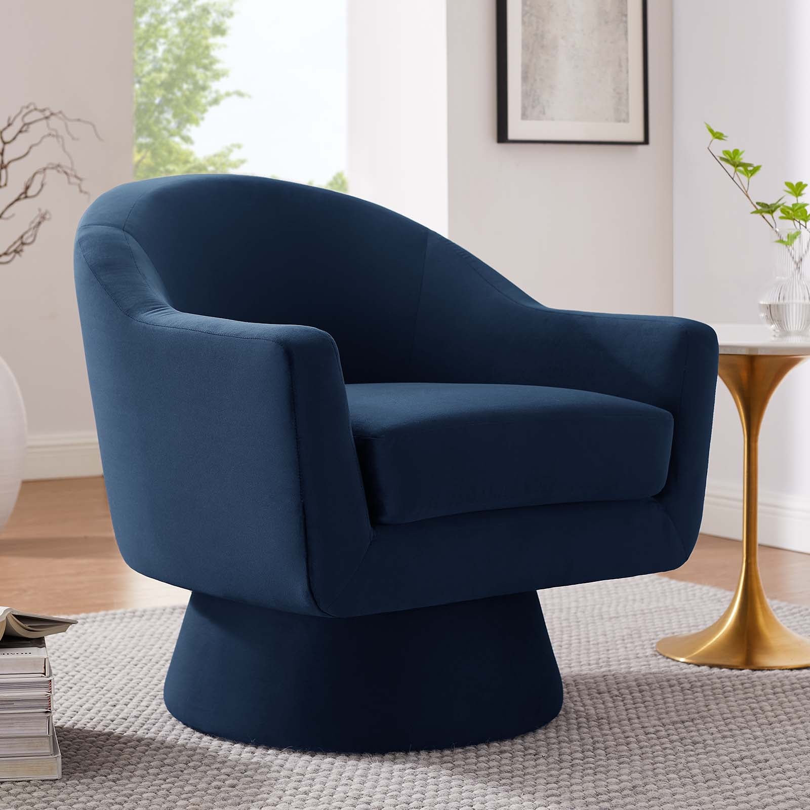 Initiate luxe texture and a sleek, modern silhouette to your living room, bedroom, office, or other seating areas with the Astral Performance Velvet Swivel Chair. Boasting sweeping armrests and a tailored profile, this accent chair is upholstered in stain-resistant performance velvet fabric. Dense foam pads the chair and the removable seat cushion to offer a premium seating experience. Suiting the needs of any moment, this upholstered chair rests on a tapered base complete with 360º swivel. Includes non-marking foot pins to protect flooring. Minimal assembly required. Weight Capacity: 330 lbs.