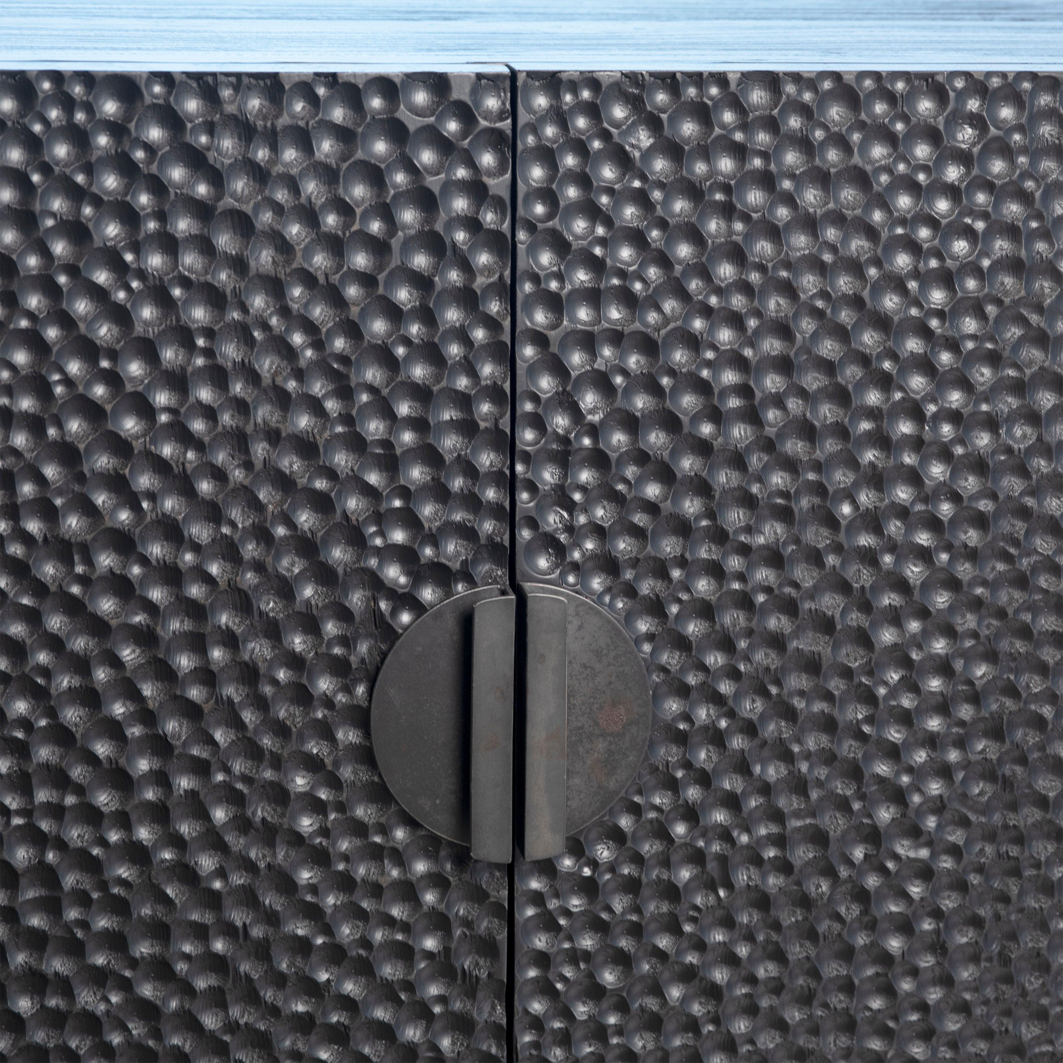 Give guests something to talk about with this beautiful 79" Athens Sideboard. Made of reclaimed pine wood and finished in a rich black stain, the unique door-front texture will beg to be touched. The four door fronts are complimented by striking semi-circular iron handles for easy opening. The interior boasts 2 large storage shelves for all your entertainment needs.