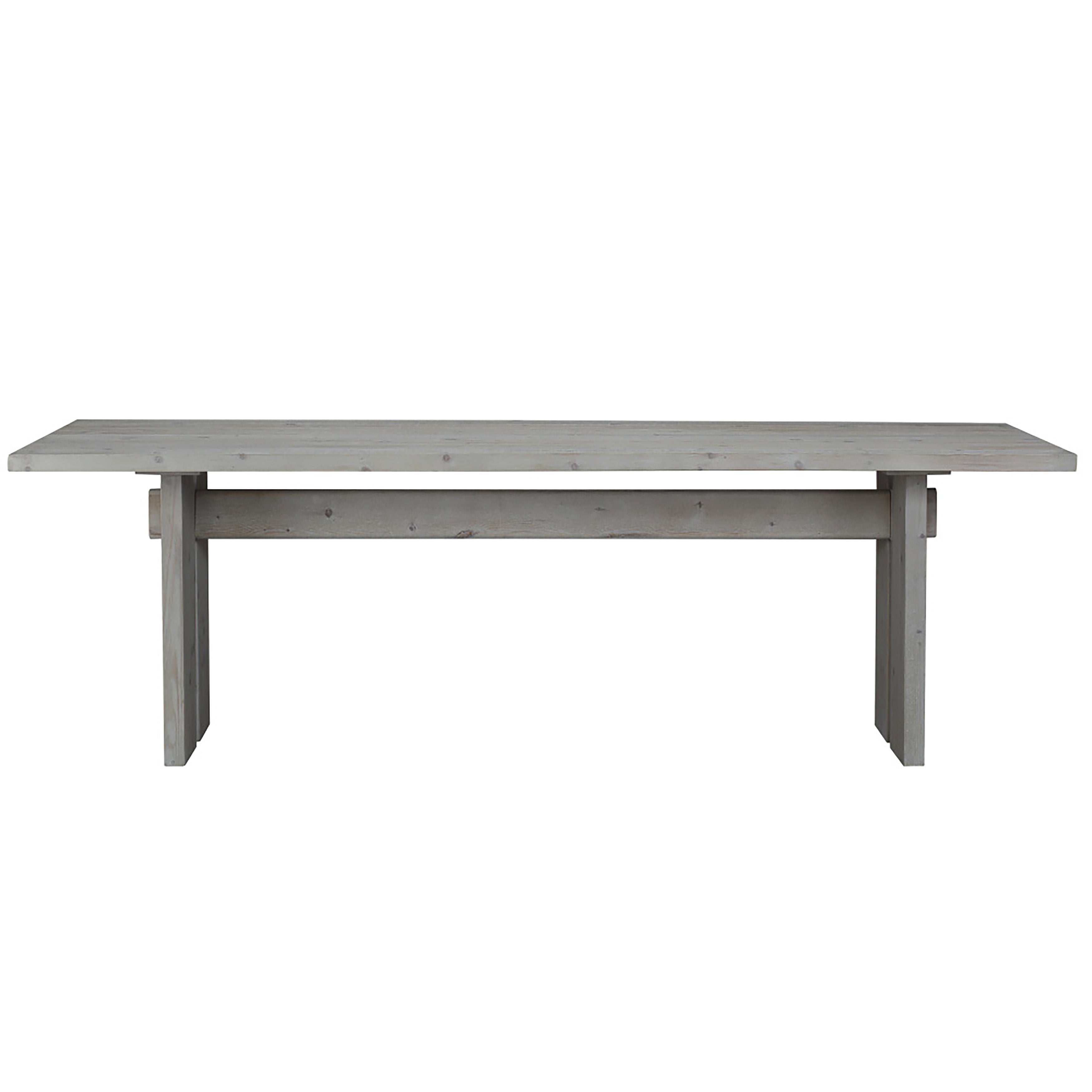 A stellar option for larger spaces. This 94 long dining table is constructed from solid white pine wood for strong and sturdy quality. Featuring just enough eye-catching appeal showcasing the natural textures and grain of the light grey wood finish. Designed to blend beautifully with your favorite dining chairs, this table complements traditional, modern and farmhouse decor alike.