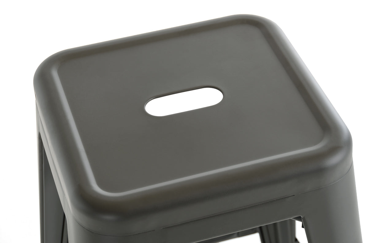 The Modrest T-5825 Modern Grey Metal Bar Stool features a simple shiny matte finish with sturdy footrests and cross bars underneath the seat. A small oval opening in the center of the seat serves as ventilation. This stackable metal bar stool is sold in sets of 4 and has a dimension of W17" x D17" x H26".