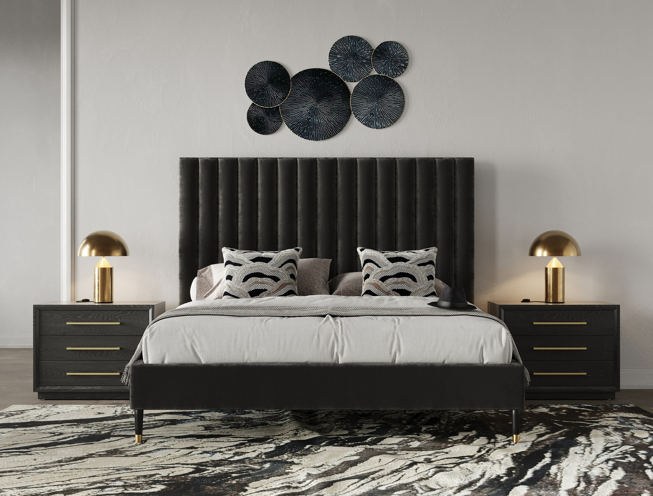 Create a simple yet elegant style in your bedroom with the Modrest Hemlock Modern Grey Velvet Bed. Donning a tall headrest with a pleated design in front, it is upholstered in soothing grey velvet fabric. Complementing the headrest is a sunken mattress frame with slats to ensure good aeration and to keep the mattress in place even if you move a lot while asleep. This modern bed serves your sleeping needs perfectly and adequately, making your bedroom a quiet resting area. Tapered legs with gold rings on each end provide sturdy support.