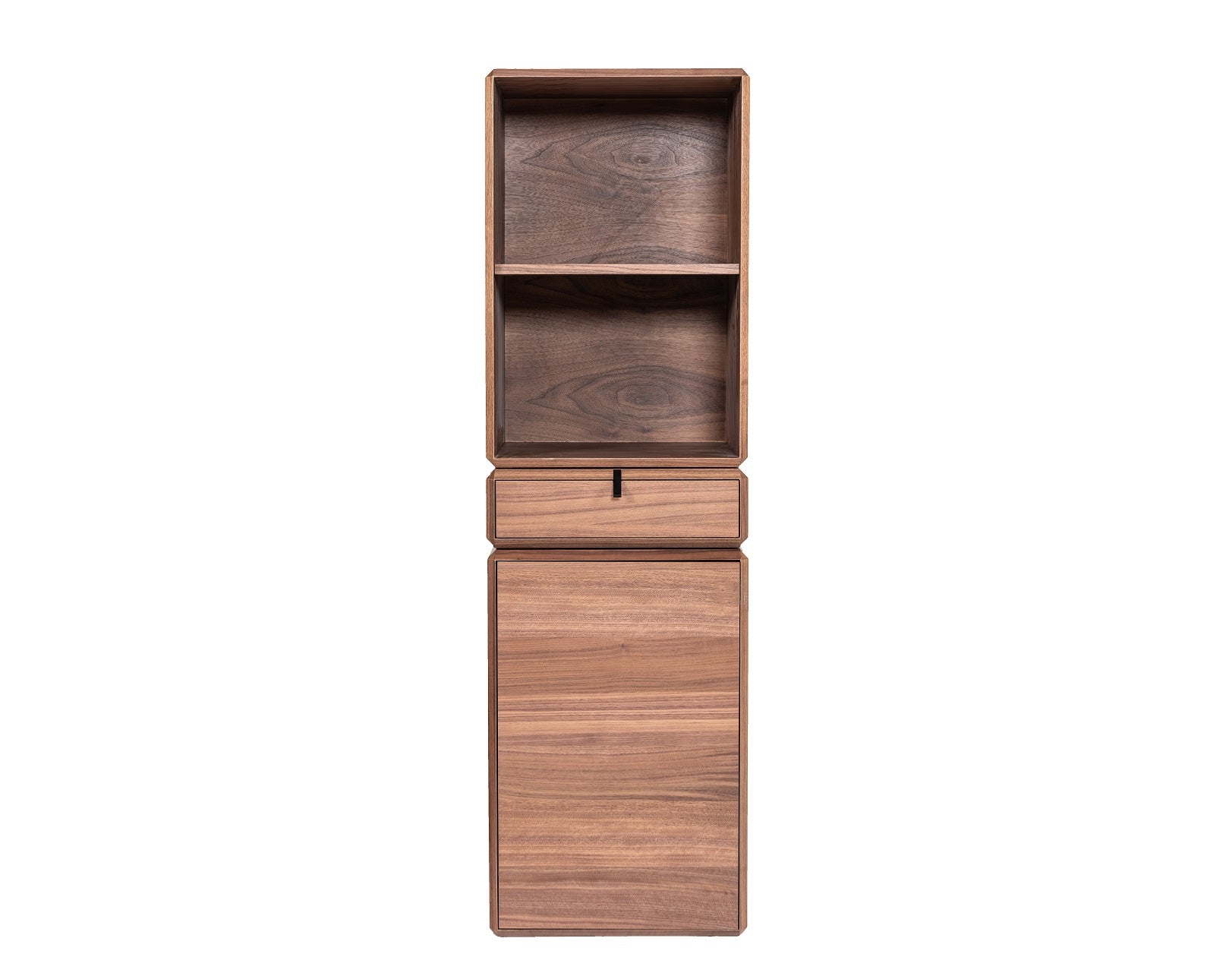 The Maceo Shelf is a modular wonder tower, including an open shelf top, a deep drawer with black metal angled pull, and a cabinet with a door and fixed interior shelf. All individual, modular pieces have beveled edge detailing that adds a small geometric twist to the overall silohuette of the piece. The walnut finish, and clean lines, allow the piece to fit in with many different interior styles, making it not just modular, but versatile as well.