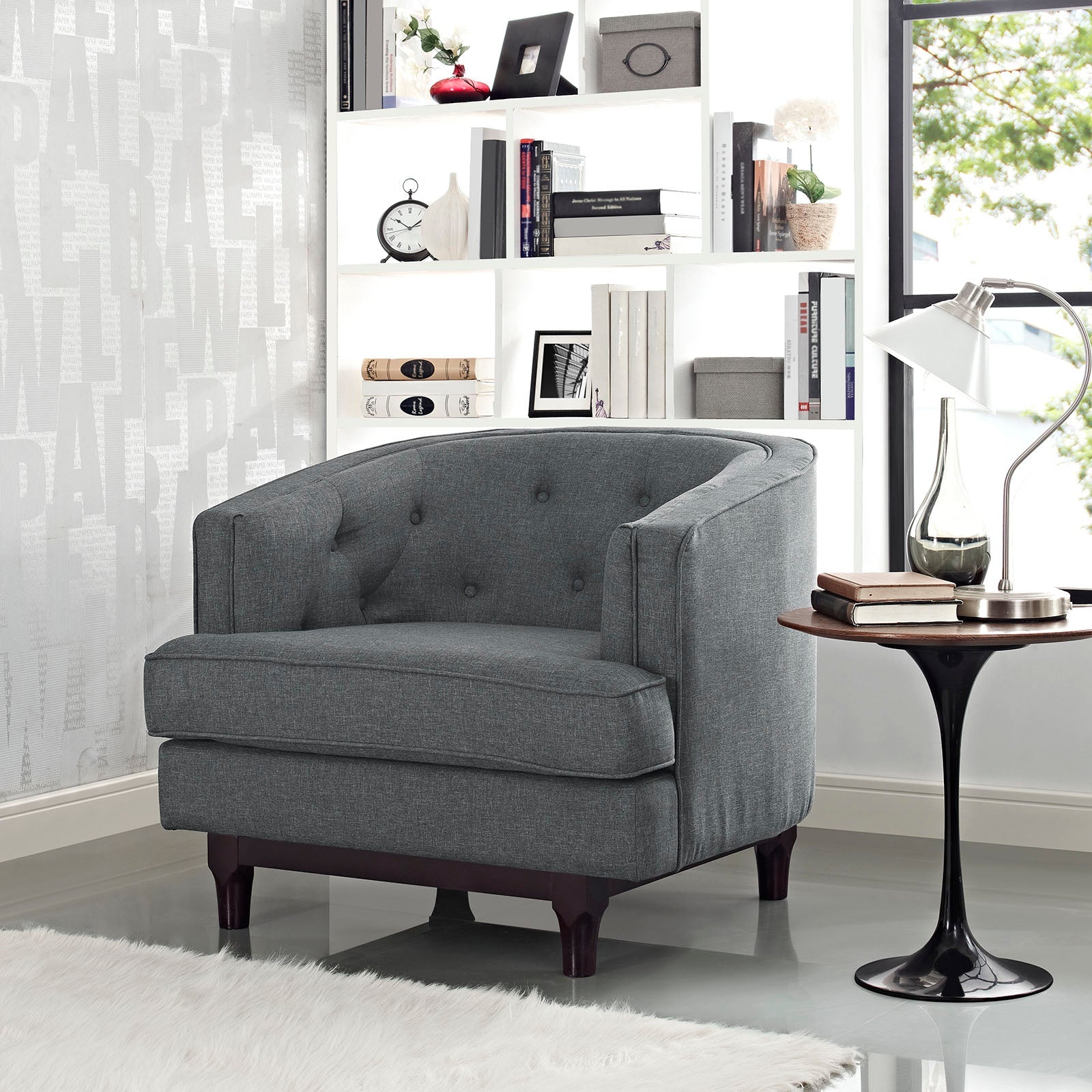 Sale the tide of elegance with Coast. Buoyed with exquisite deep button tufting and fine trim, Coast comes upholstered in polyester with a walnut stained wood leg base with non-marking foot glides. Solidly made with exceptional support, Coast features dense foam cushioning, removable seat covers for easy cleaning and generous seating space. Combining mid-century style with ageless nobility, the Coast armchair is perfect for modern and eclectic living rooms, lounge spaces, and reception areas.