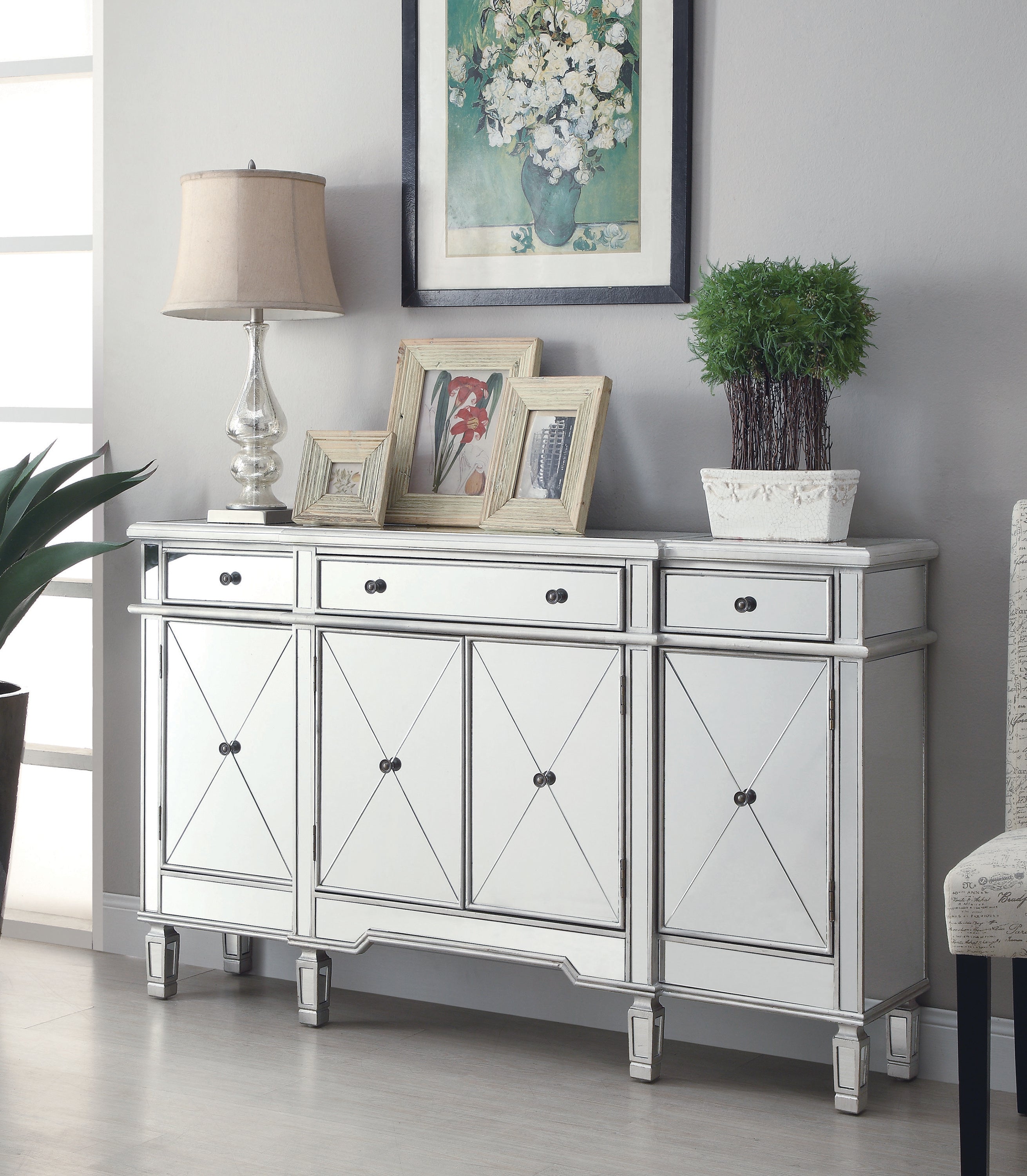 Large glamorous wine cabinet is a must-have for wine lovers. Distinctive mirror panels are a lustrous accent to any dining room or entertainment room. With four doors that open to your collection of vintages. Three drawers for stashing accessories like silverware and a cheese board. With two shelves and a removable wine holder, the next party is all yours to host.