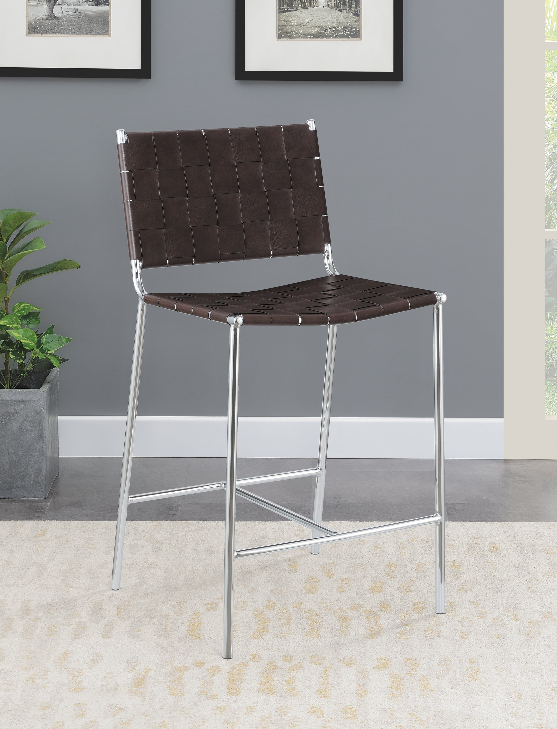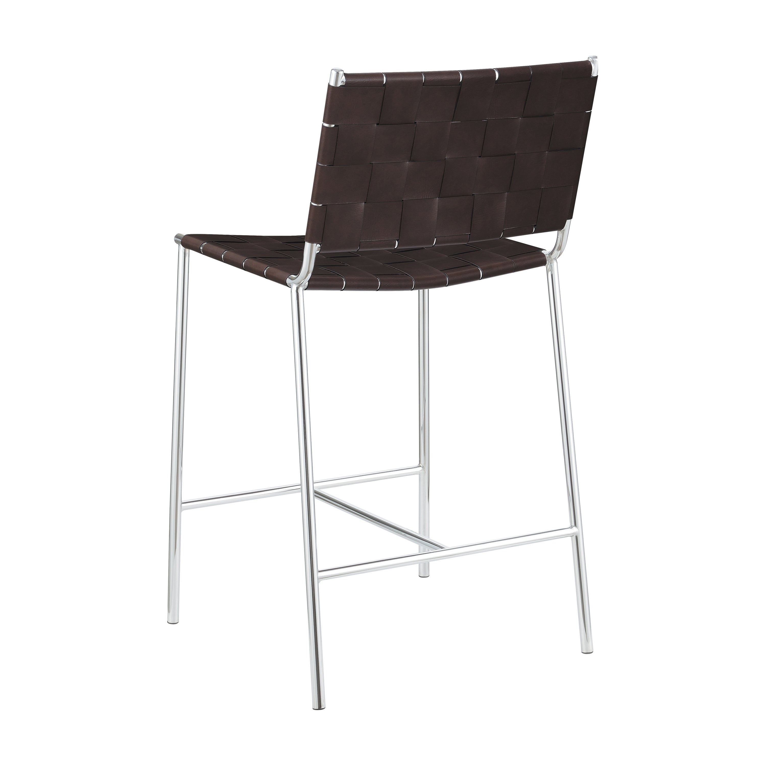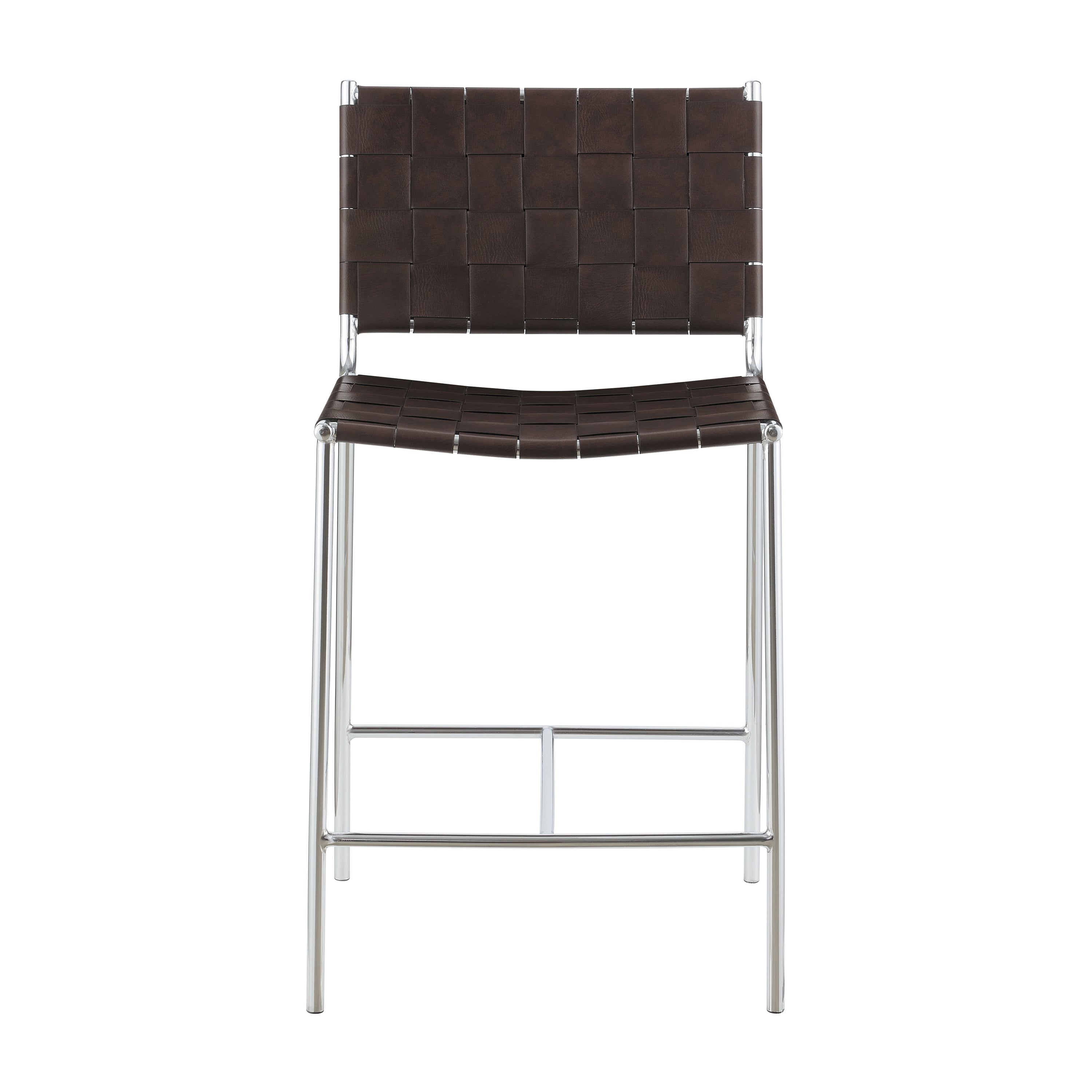 Metal finish: ChromeMid-century elements lead the design aesthetic of this contemporary stool. A slim metal frame in a gleaming chrome finish offers a striking contrast against the brown faux leather accents. Narrow leatherette bands weave together to create a backrest and seat, supported by the metal frame. Slender legs extend to the floor, connected with an H-shape footrest trestle design. Sophisticated and refined, this stool lends itself wonderfully to modern home bars and kitchen counters.