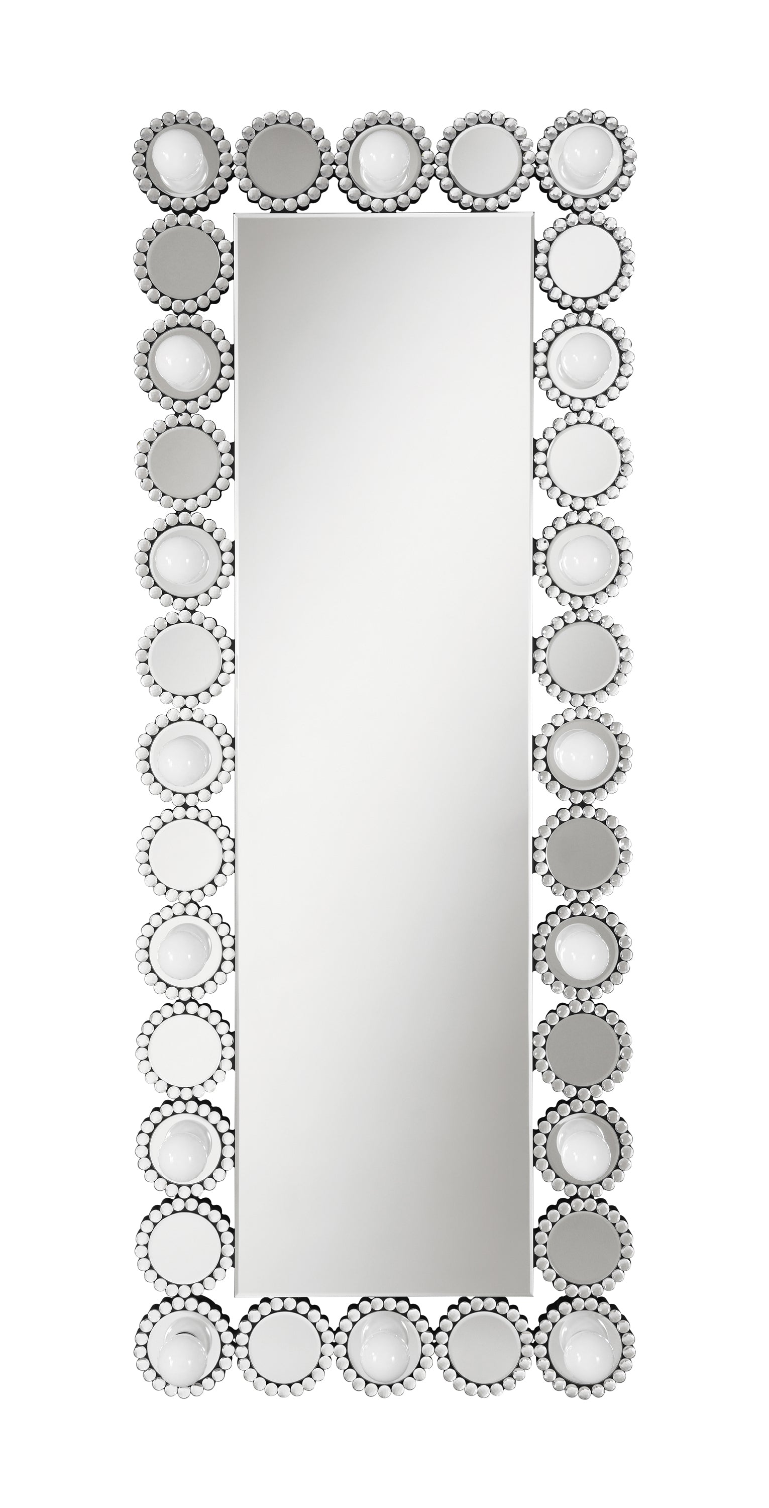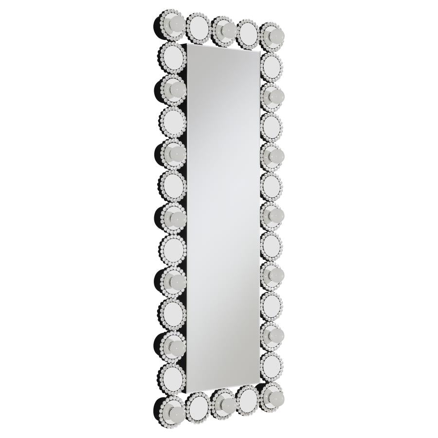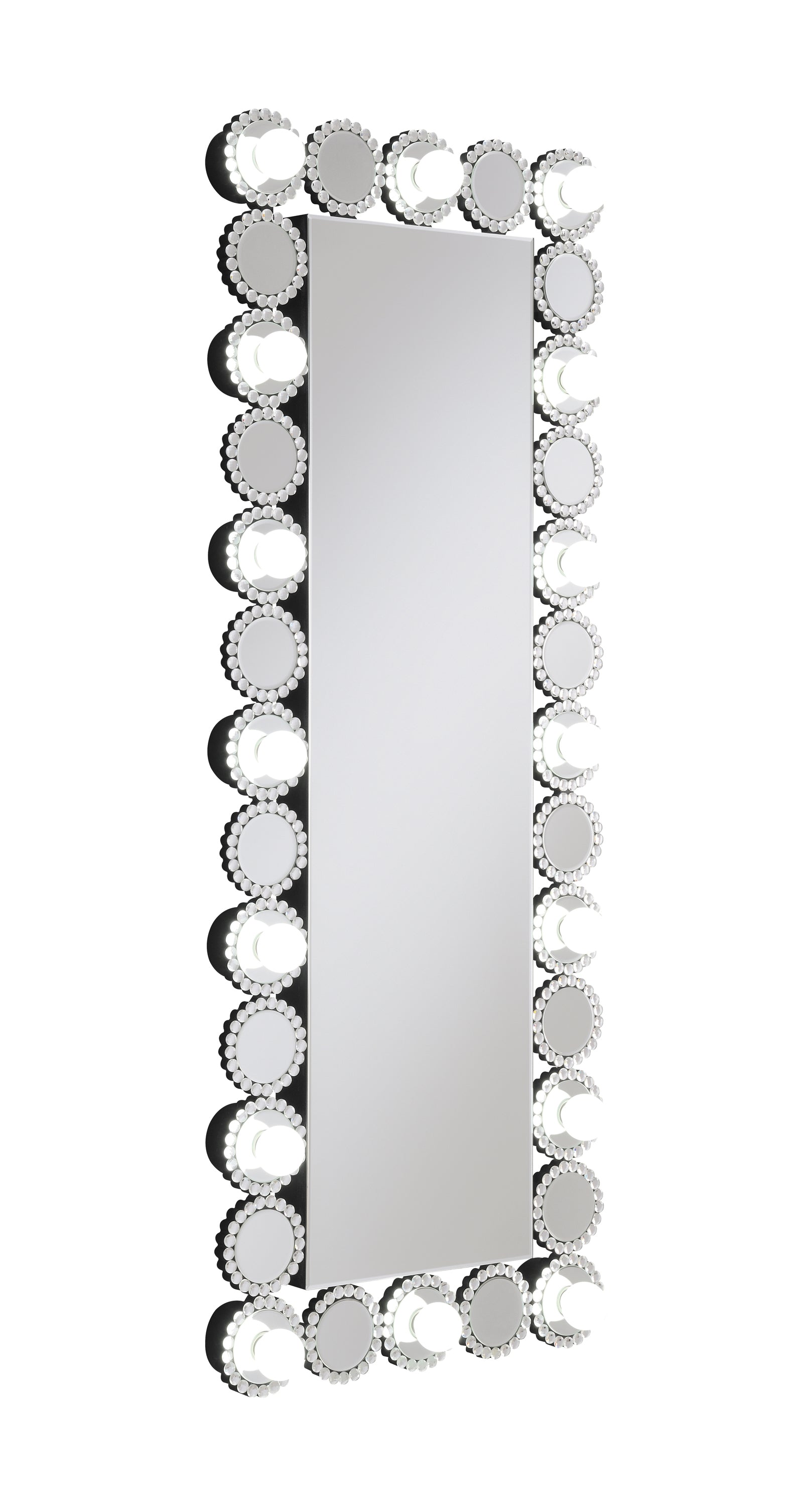 The contemporary full-length mirror lends a wonderful accent piece to your rooms. Featuring 16 LED lights that offer an even glow adding a glamour style to this piece. The Hollywood inspired frame is bordered by individual round mirror tiles, each further framed in sparkling mirror trim. Bold lines and sophisticated mirror plates merge to offer a modern touch. Situate this striking accent mirror within an entryway foyer to greet family and guests, or simply find your beautiful look through this mirror.