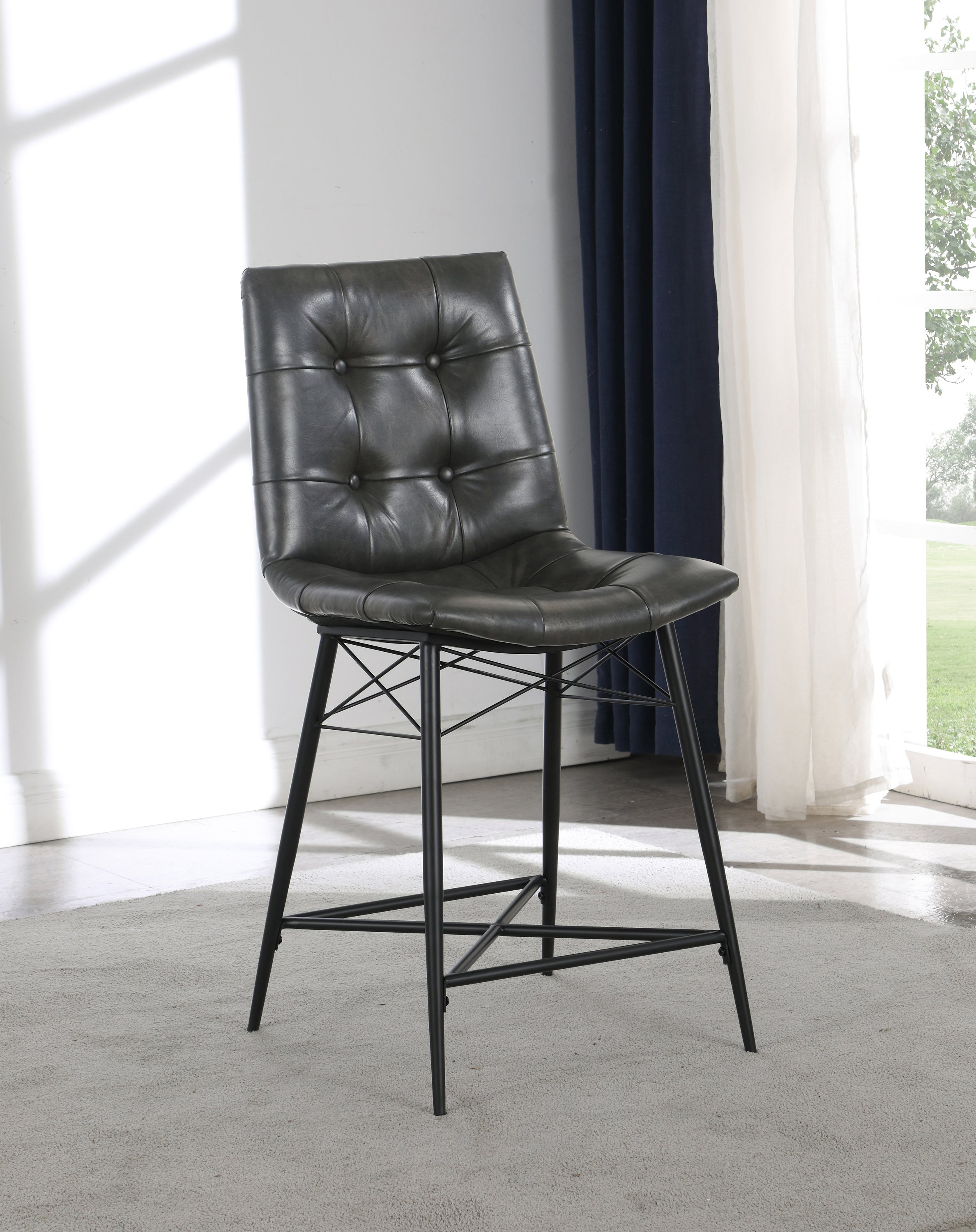 Cool and cozy, this counter height stool is the ultimate dining room upgrade. The padded seat is wrapped in smooth leatherette for an inviting look and feel. Button tufting adds a subtle, decorative touch. A sleek, metal base gives it a modern look while providing plenty of support. Crafted for comfort and lasting durability, this contemporary stool is a smart and stylish choice for the modern home.