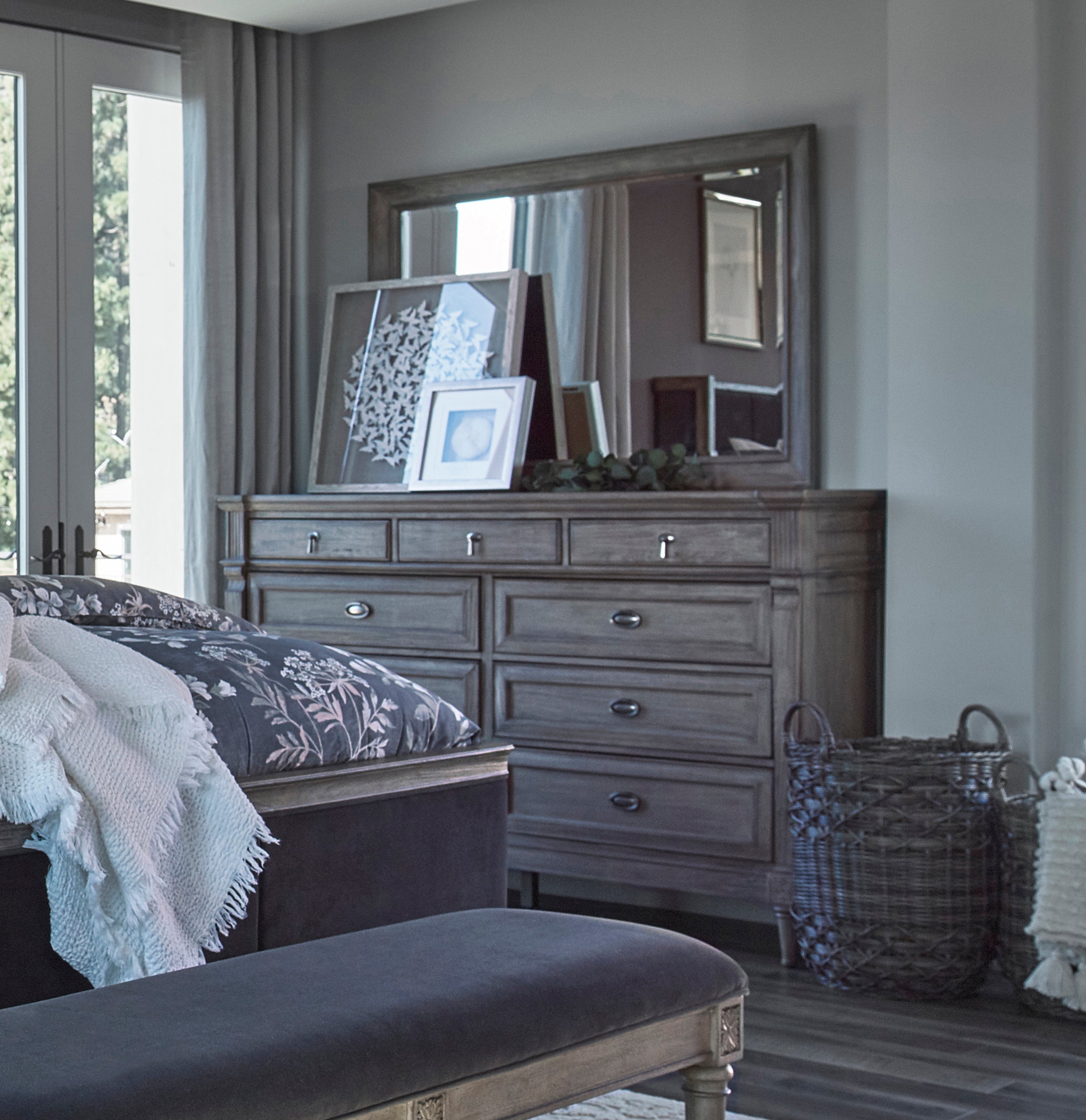 Enhance the elegant ambiance of your home with the updated transitional design of this nine-drawer dresser. It's fashioned in a gorgeous classic French neoclassical design reimagined for today's discerning tastes. The stunning sand blasted wood finish is crafted with just the right amount of French grey. The drawers are built with antique silver metal finished pendant and ring pull hardware, as well as with a removable jewelry tray. Turned tapered legs add a graceful touch to this majestic dresser.