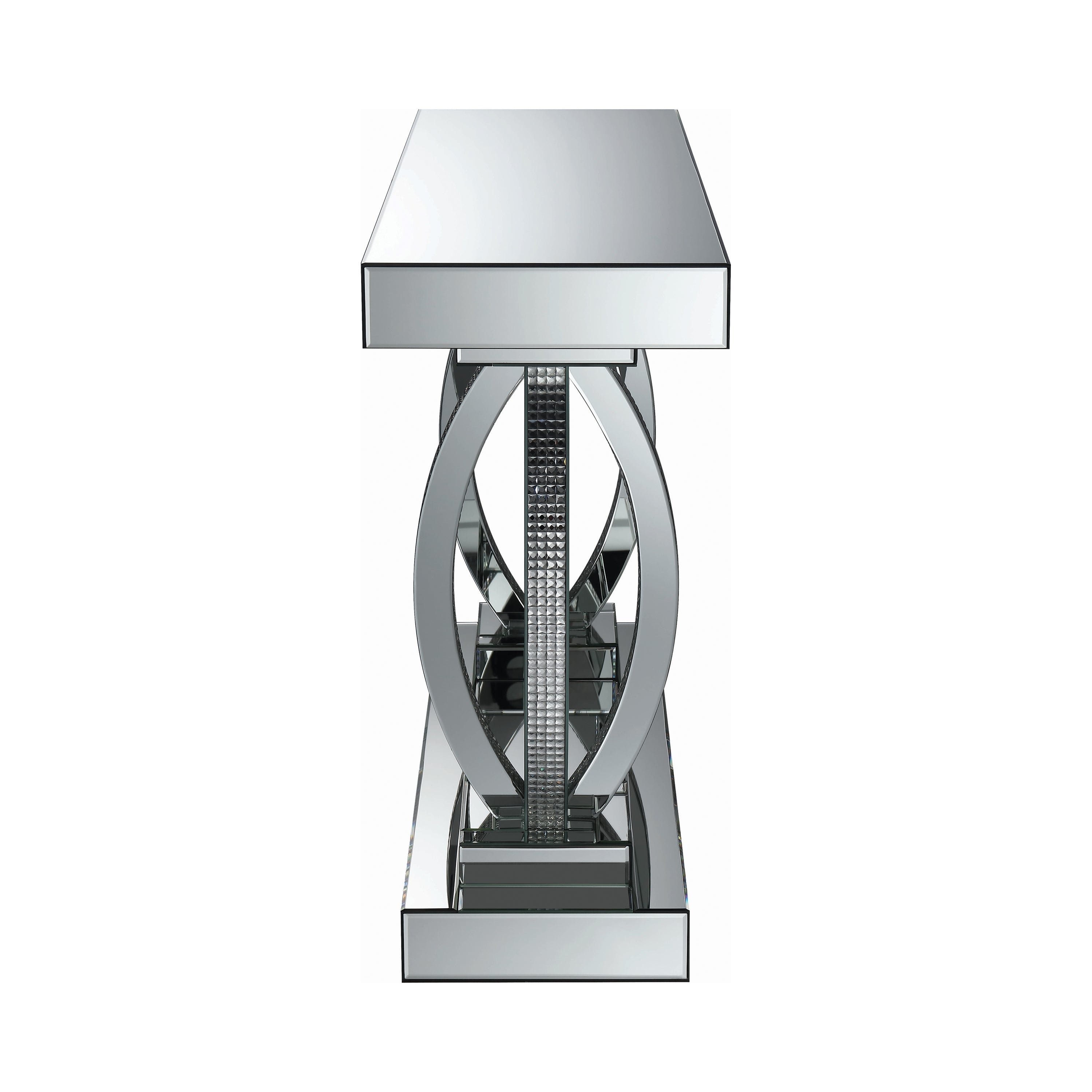 This striking, silver sofa table adds a decorative accent to any home. Its sleek, compact size makes it perfect for smaller spaces. A cool, silver finish elegantly accentuates its modern silhouette. Textured silver accents play up the stunning style of its bold, c-shaped supports. Creatively crafted, this table makes a stylish statement that's sure to enhance your contemporary decor.