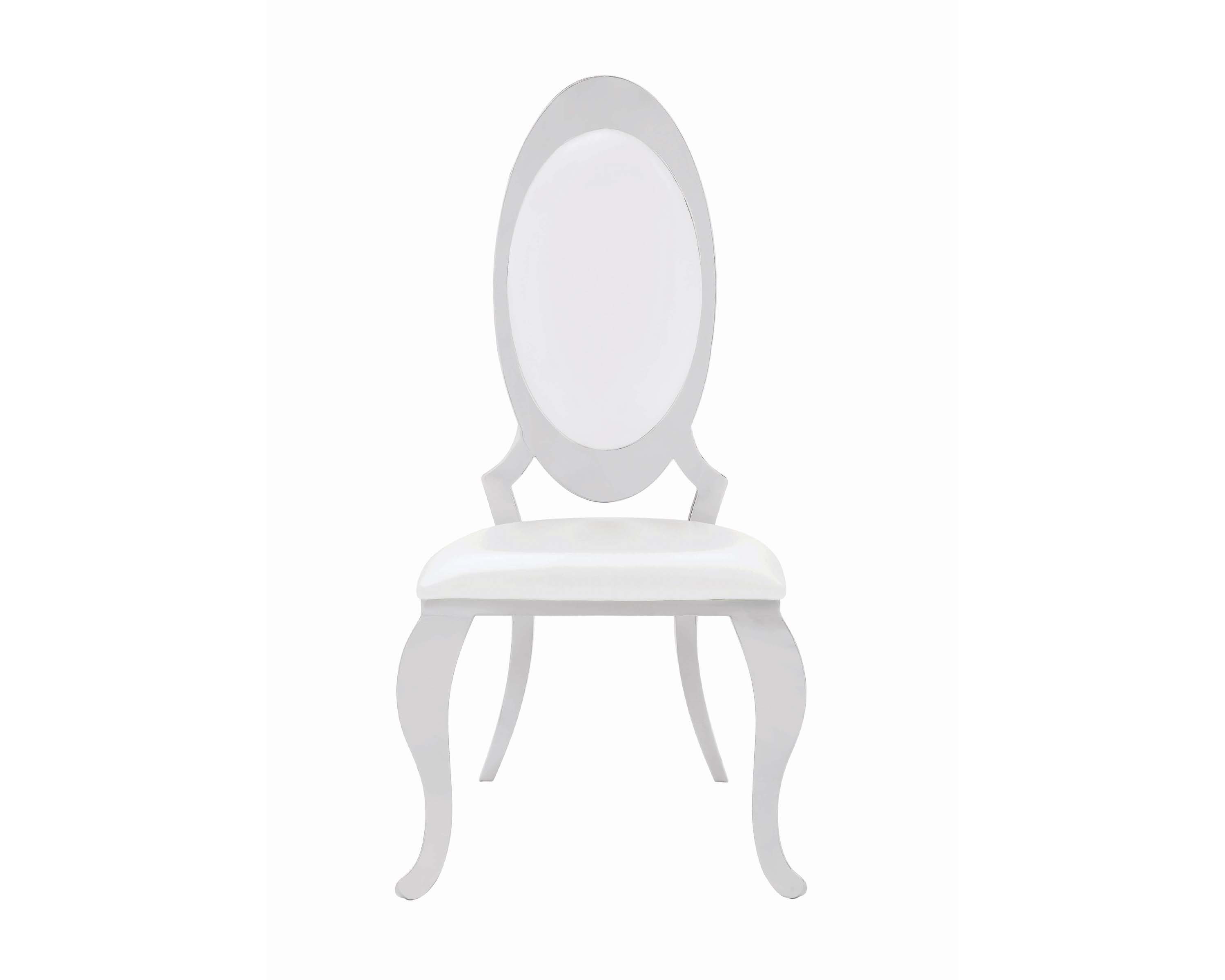 Regal ambiance in a transitional package. Enjoy a hint of fresh modern style in this dining chair. A traditional silhouette features a lovely oval seat back and ornate curved legs. Creamy white upholstery delivers a bright effect that contrasts with a chrome finish frame. Lift the personality of any space with this exceptional dining chair.