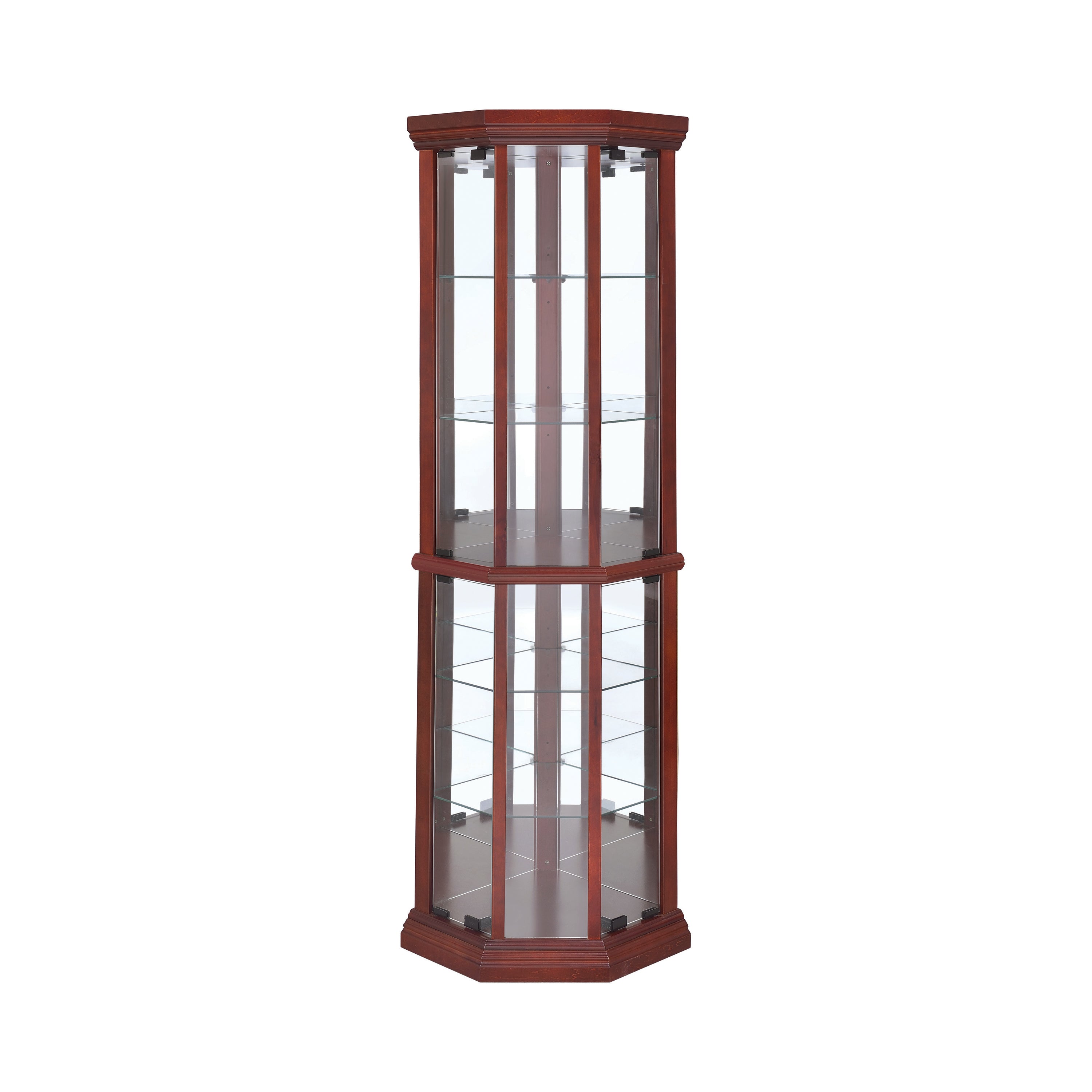 Warm, medium brown finish adorns this transitional corner curio cabinet