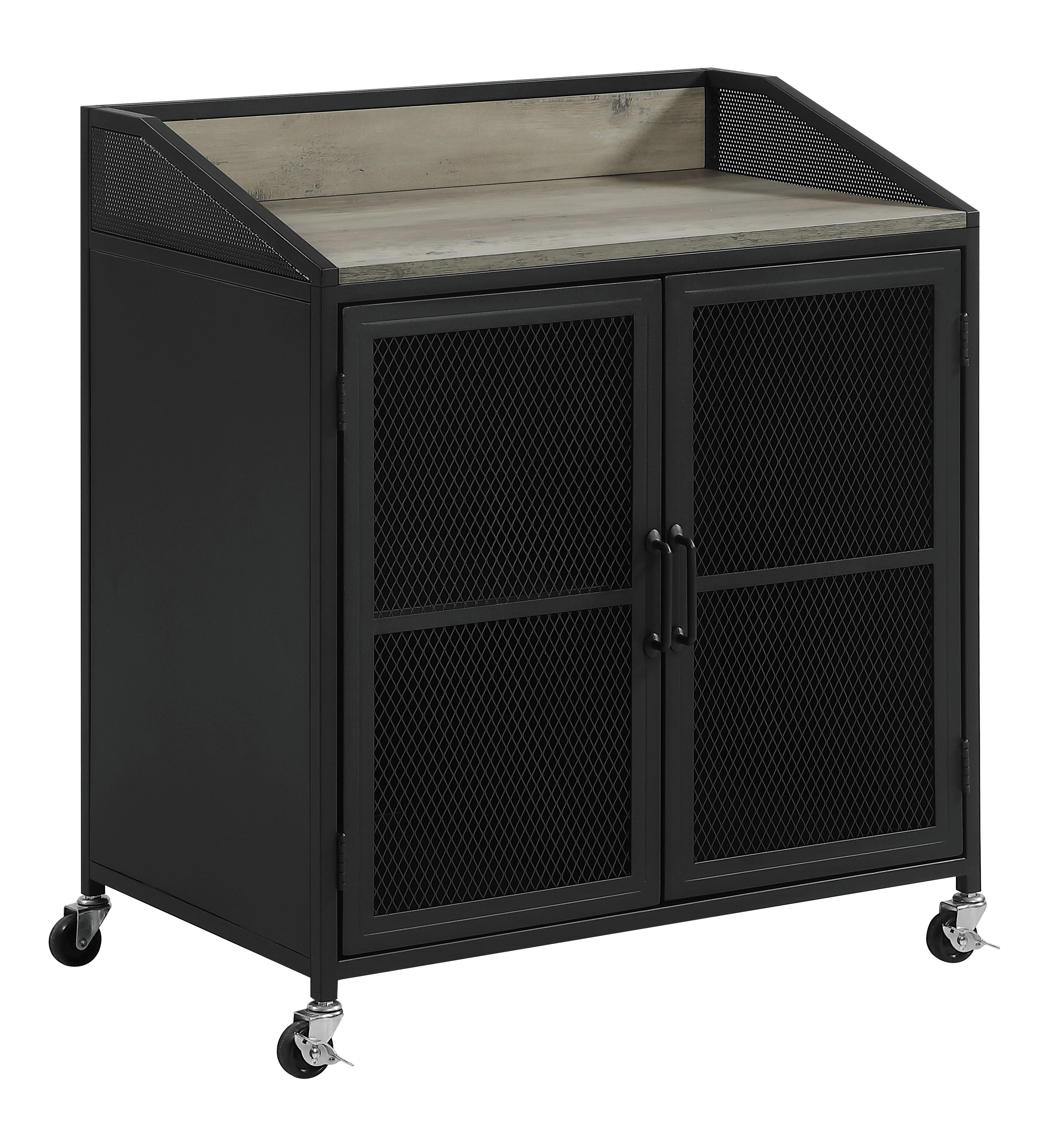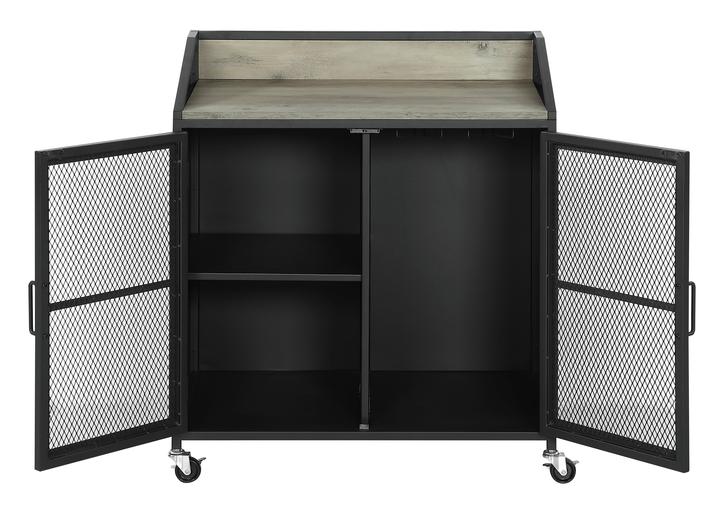 This industrial style wine cabinet offers ample space for keeping favorite vintages, corkscrews and accessories. Designed with a sandy black powder coated finish over a durable steel frame, this functional wine cabinet can be placed in a modern farmhouse home or contemporary loft apartment with limited space. Set on rolling casters, this wine cabinet goes wherever you need to entertain in the home. A gray wash top surface invites decor and seasonal glassware to proudly display. In addition, a two-door cabinet below with see-through wire panels keep stemware and other wine serving essentials tucked away neatly.