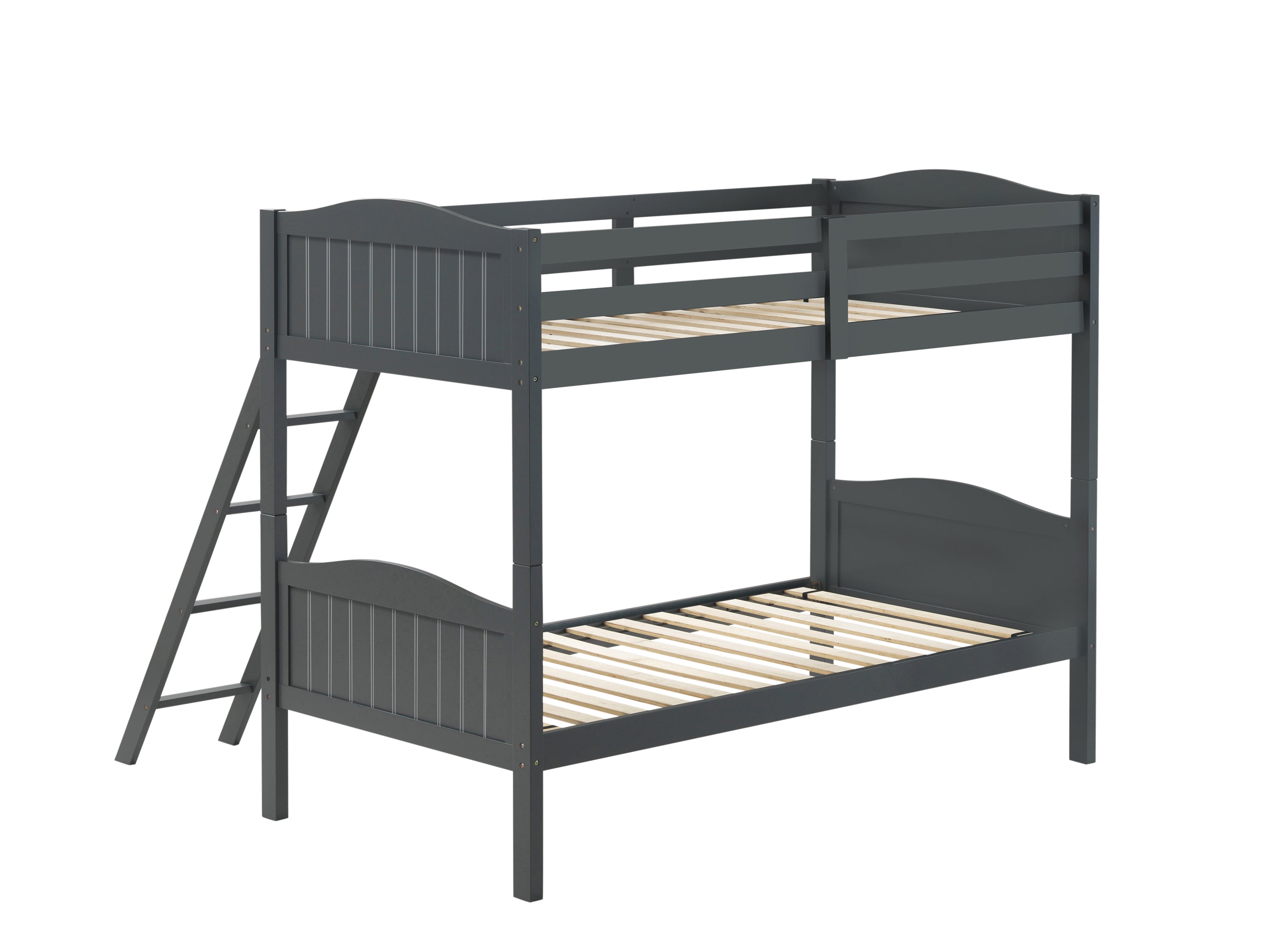 Create more floor space in your kid's room with this simple, yet modern bunk bed. Available in several colors, this bunk bed can lend to any room's current color palette. The camelback headboard and footboard offer a plank style look, along with a square, straight frame silhouette. An angled ladder allows kids to get to the top bunk, which also offers secure guardrails on each side. Place this bunk bed in siblings' shared bedroom space to accommodate more room.
