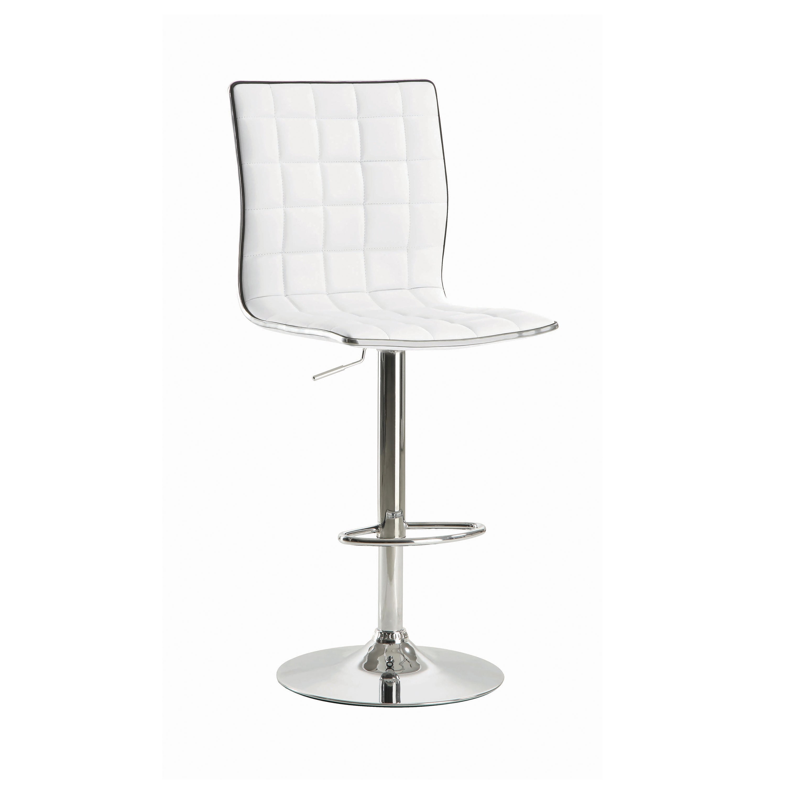 Gleaming chrome accentuates the clean, modern silhouette of this adjustable barstool. Its armless seat boasts a full back with waffle texturing created with intersecting lines for a dimensional look. Delivering appealing comfort, the barstool includes a height adjustable seat that accommodates various counters and bar tables. Cool white upholstery with a leather-like look reinforces a clean, contemporary profile. A pedestal base shows off a gleaming chrome finish and includes a built-in footrest for optimal comfort.