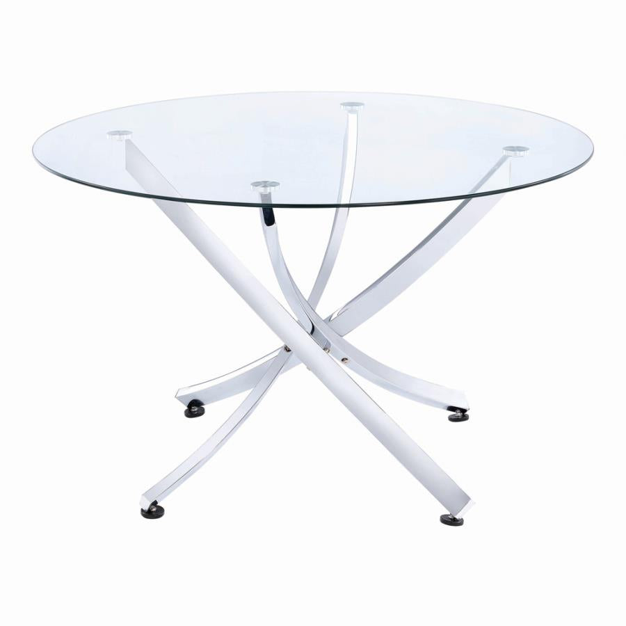 Modern meets bold in this everyday dining table. Round table top is constructed of glass for a contemporary feel. Chrome legs crisscross in a stylish pattern that imparts both style and durability. Consider chairs with lustrous chrome styling (available separately) to complete this set. Table looks great in dining space with sleek furnishings and modern decor.