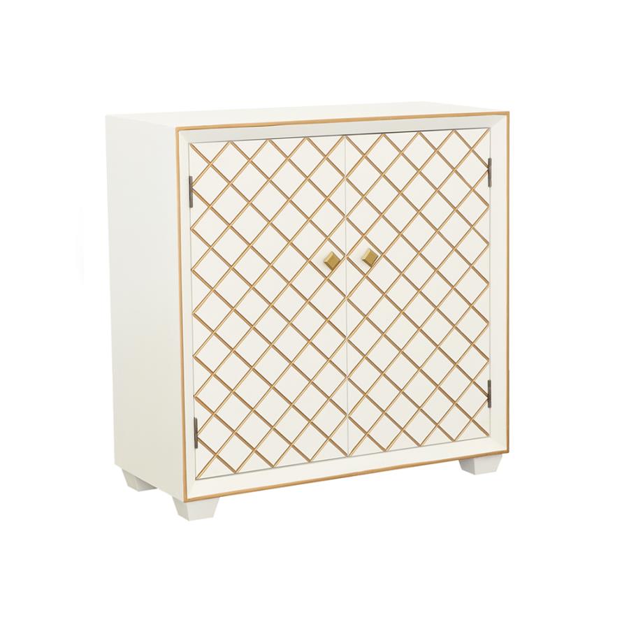 Breathe new life into your decor with this gorgeous, wooden accent cabinet. Elegant tones of white and gold add stylish allure to this piece. The front is adorned with a gold lattice design for a lavish, luxurious look. Gleaming gold hardware rounds out its design in ultra-chic style. This beautiful cabinet is complete with two doors for convenient, concealed storage space.