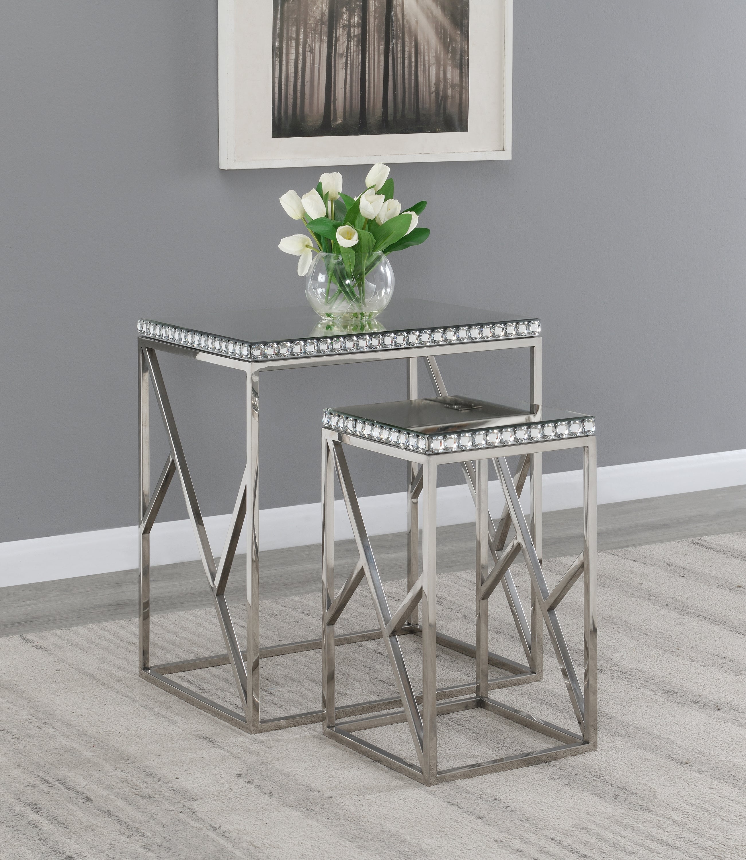 Show off your love for sparkle and shimmer this spectacular set of two silver nesting table. Your eyes will instantly be drawn to the clear crystal trim. Mirrored tabletops beautifully display your favorite decor. This nesting table set is supported on a stunning geometric shaped base made from metal. This gorgeous set will instantly add stylish flair to your space.