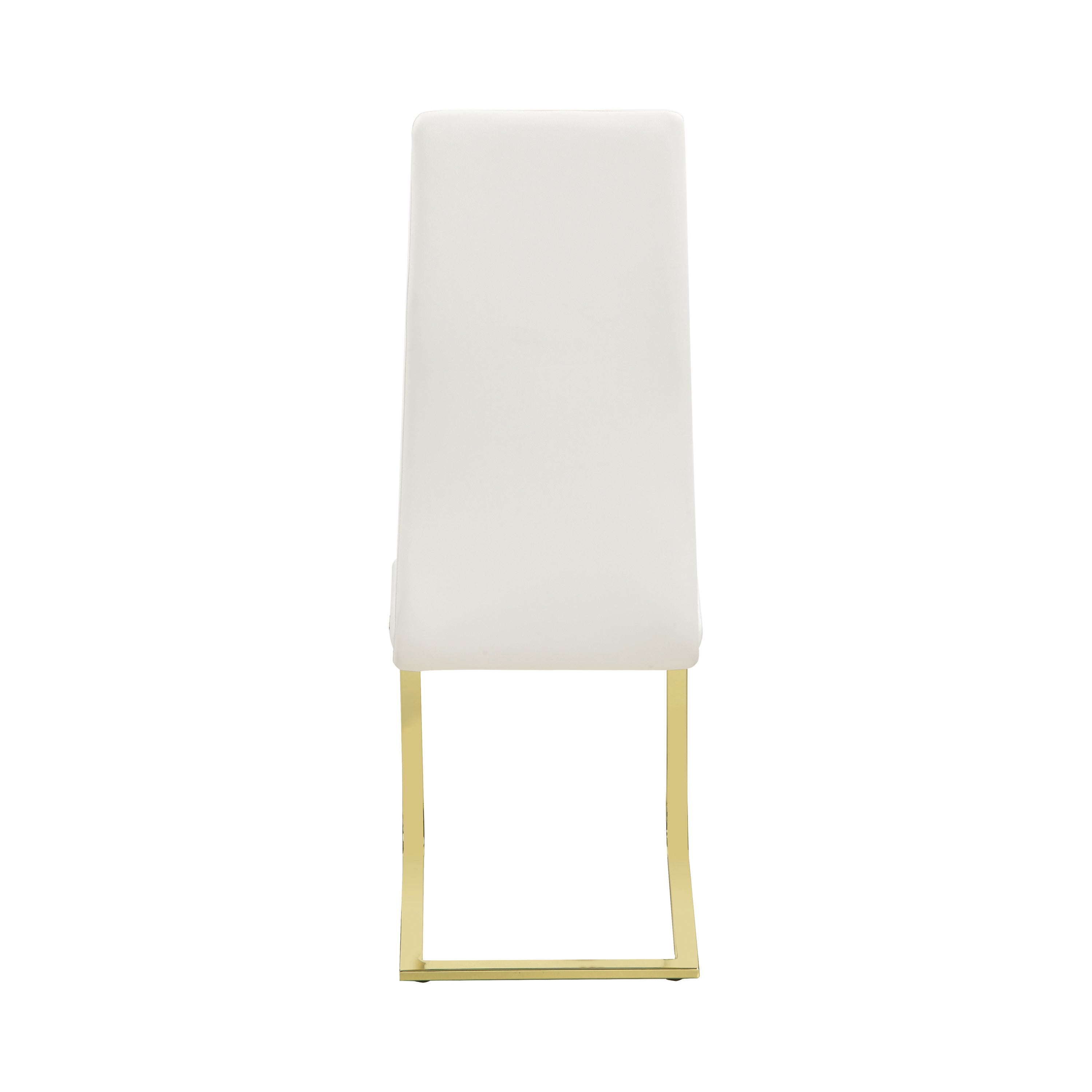 Smooth and clean, this armless dining chair adds a crisp feel to any dining room. Perfect for a bright or bold space, the L-shape legs feature a radiant gold finish. An elongated seat back tapers slightly, giving this chair its elegant personality. Soft white cushioning is dressed up with smooth seams down the seat. Create the illusion of open space with the statement-making brilliance of crisp color and metallic shine.