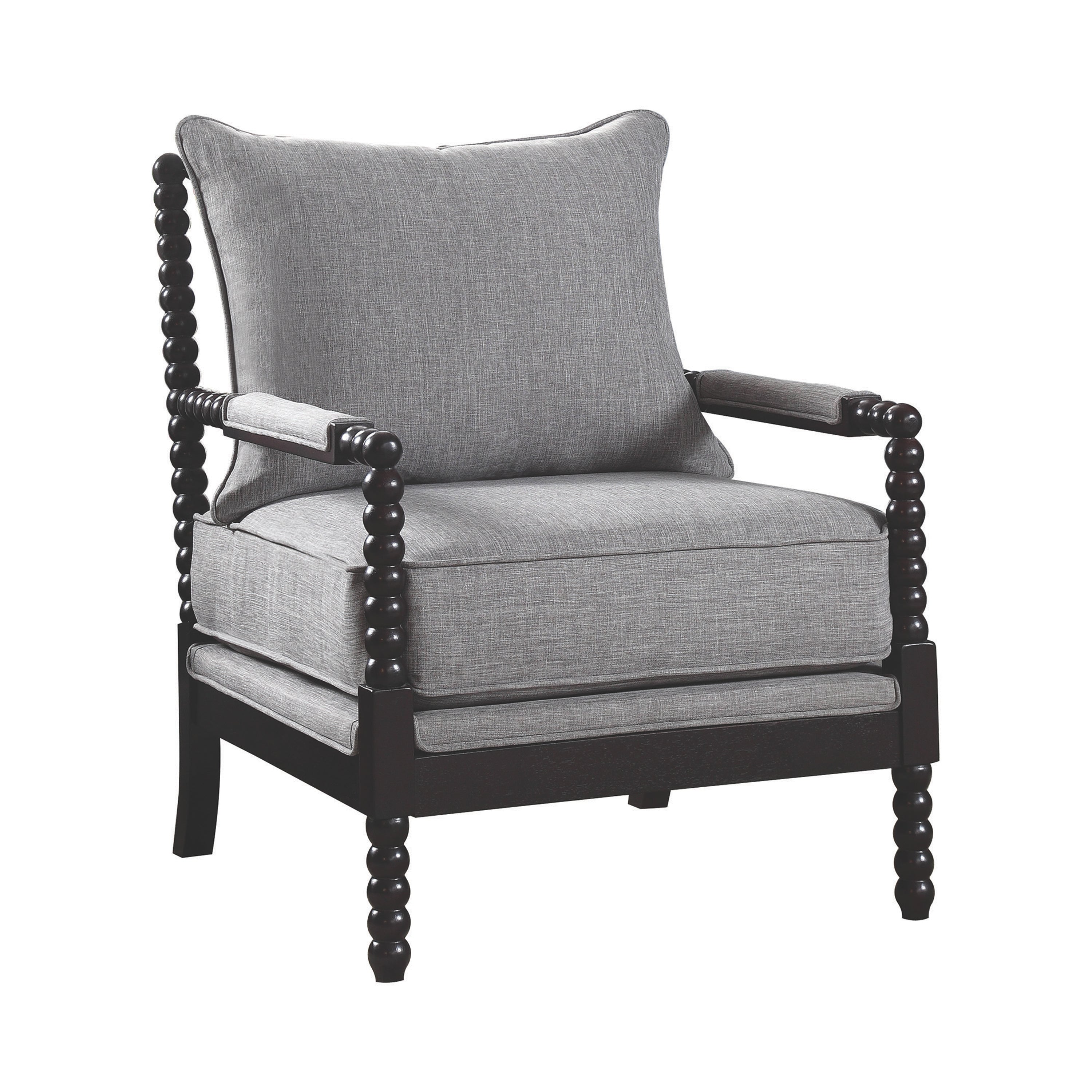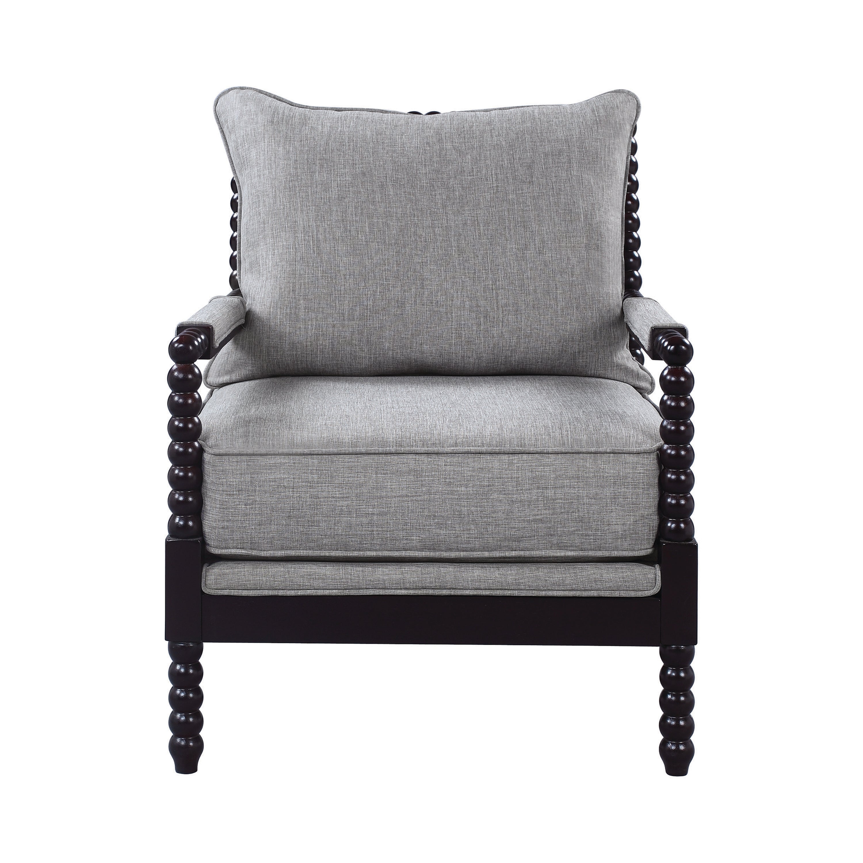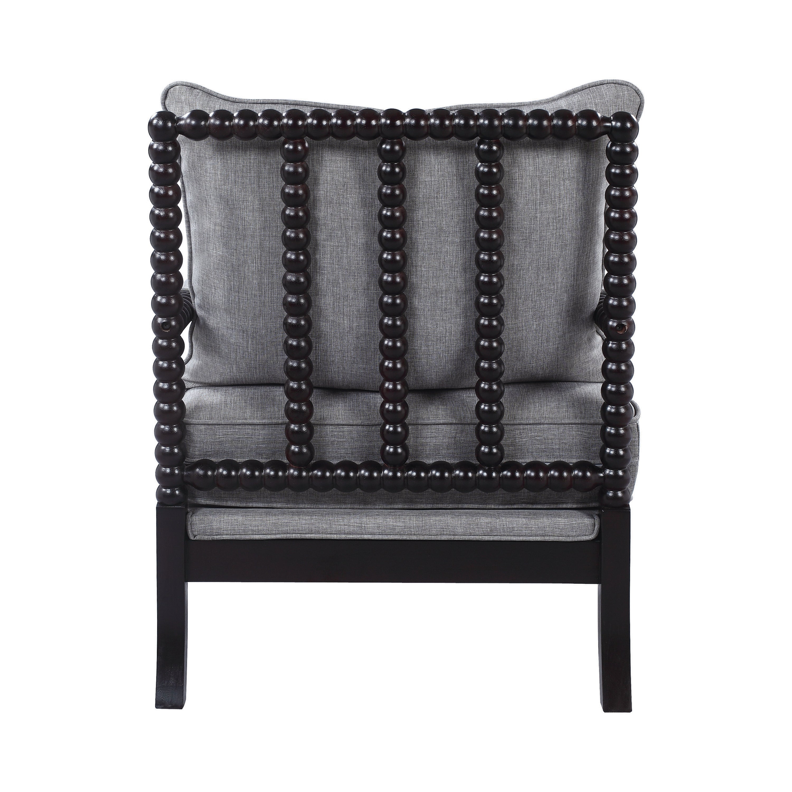 Careful attention to design detail brings a truly stylish look. Ornate elements on this accent chair offer an artistic feel that blends easily in a transitional space. A slender frame with a black finish features sweet beading to deliver romance and attitude. A lovely grey upholstered seat base and back pillow keep it simple and elegant. Stylize a family room or den with this charismatic chair.