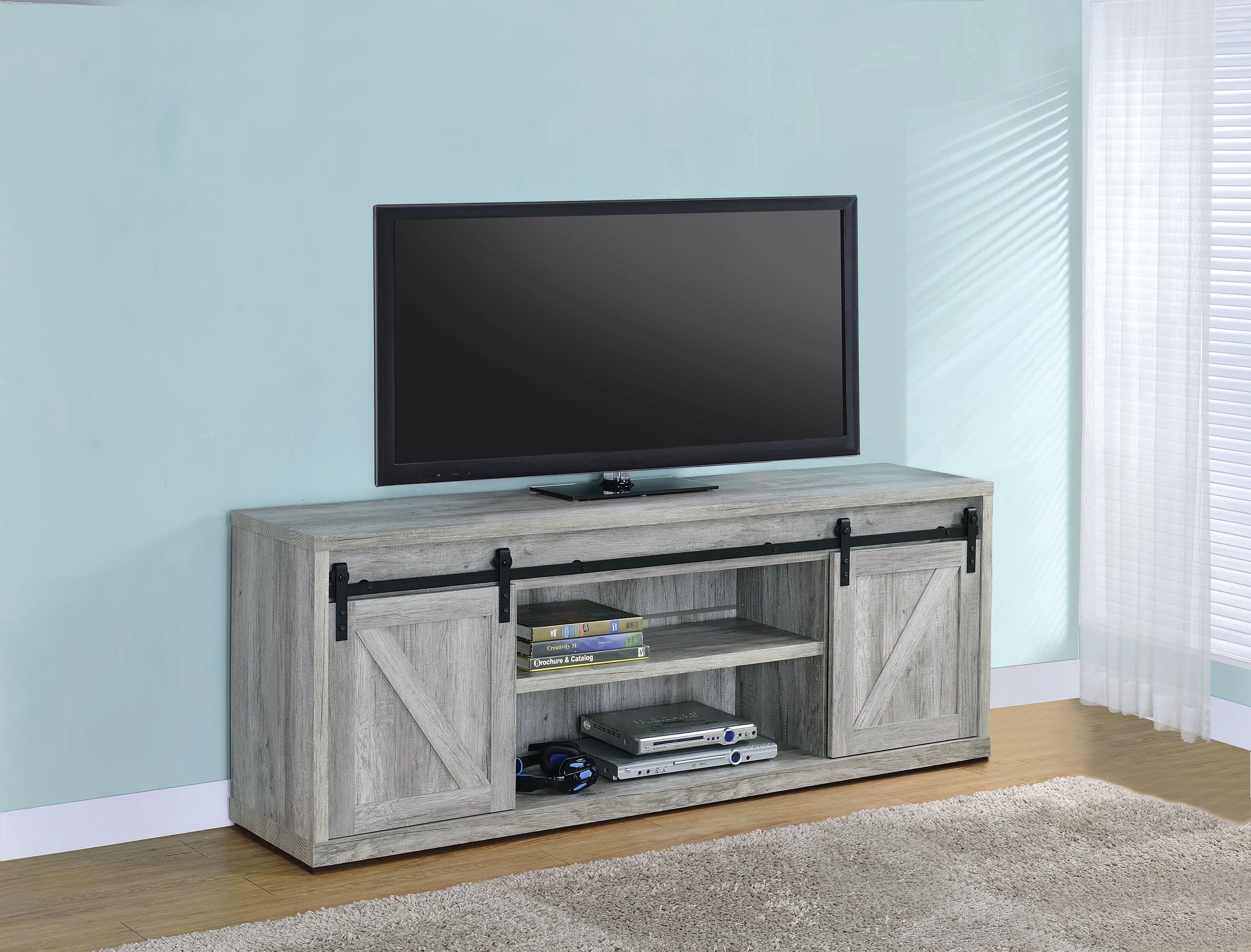 Whether you place it in a rural farmhouse, or downtown penthouse, this TV console is sure to be a hit. Clean lines give a nod to modern style. The distressed look definitively boasts of the rustic nature of this piece. Dream of life on the farm with two (2) sliding barn doors. Complement your space with your choice of colors and sizes.