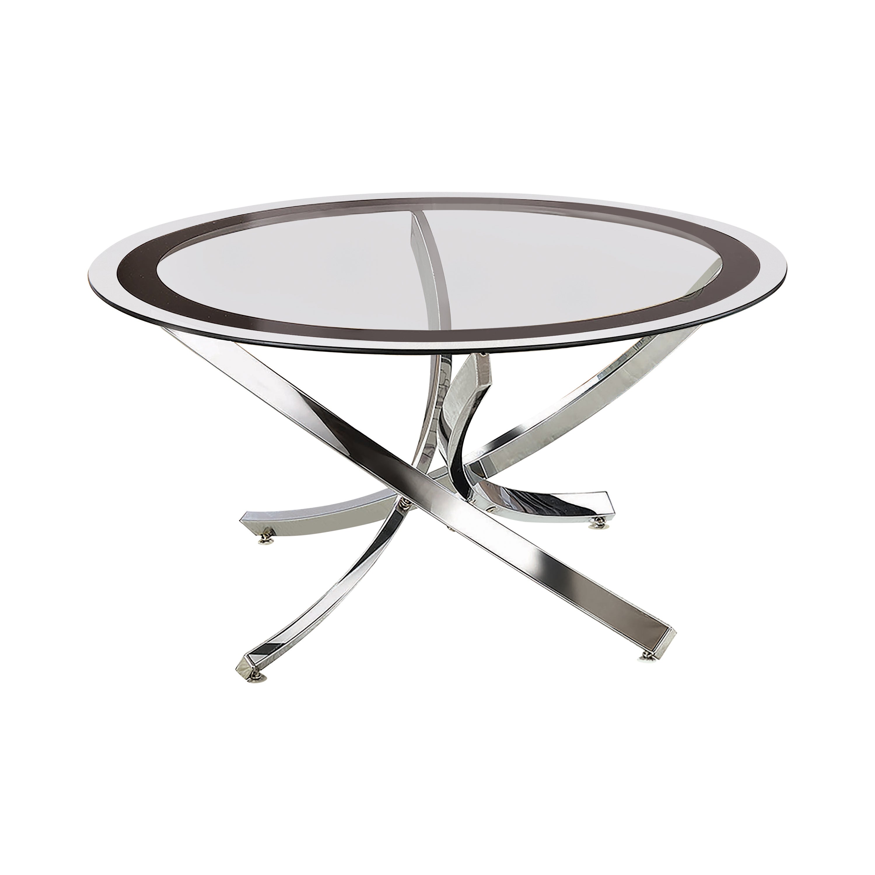 The smooth, sleek design of this coffee table adds casual glamour to any home. Gracefully curved lines of metal crisscross each other pleasingly to form its stylish support. A gorgeous nickel finish enhances its lovely silhouette with a pleasing touch of shine. Its smooth, round top is made tempered glass and boasts a beautiful, black frame around the edge. This table is ideal for relaxing with a hot cup of tea or enjoying a board game with loved ones.
