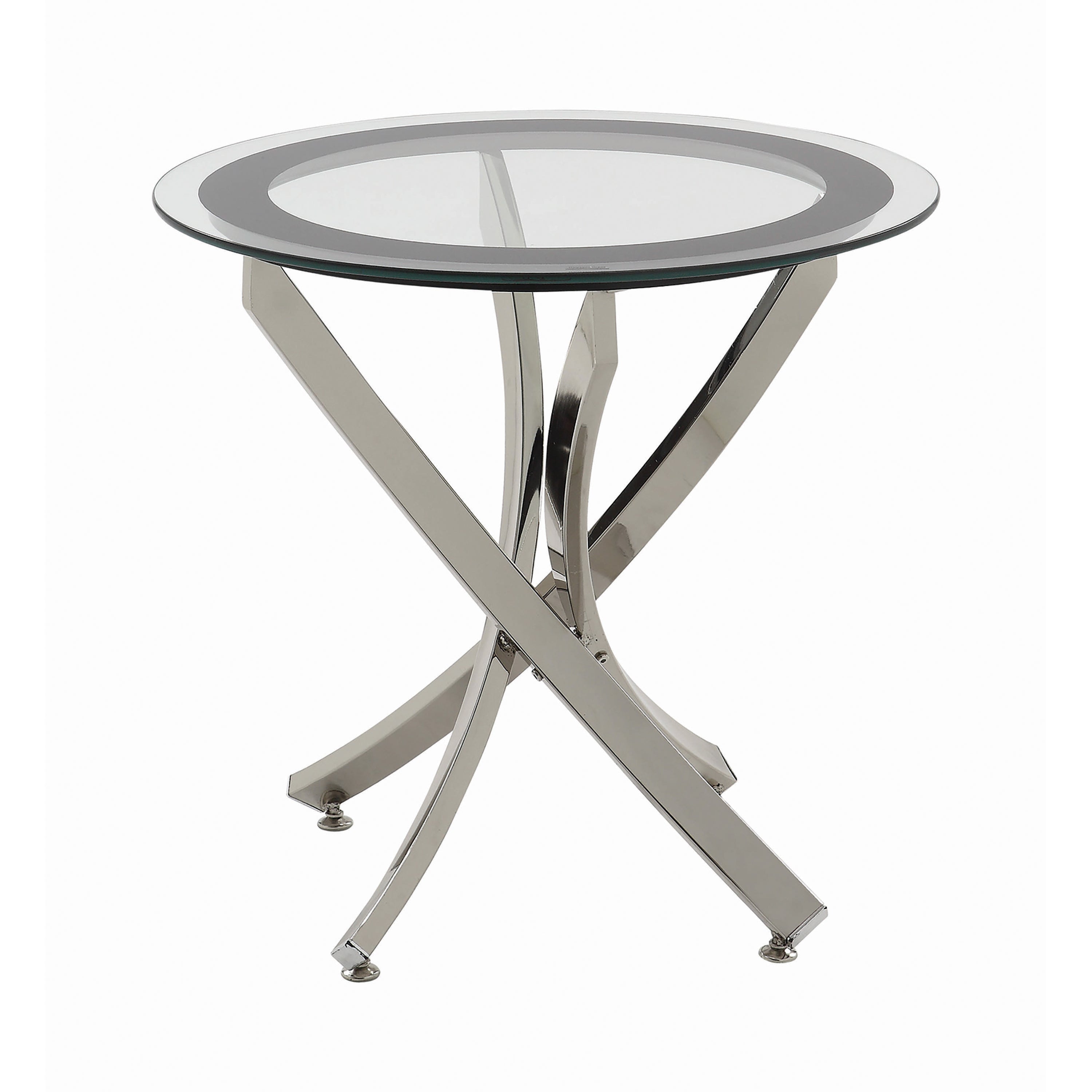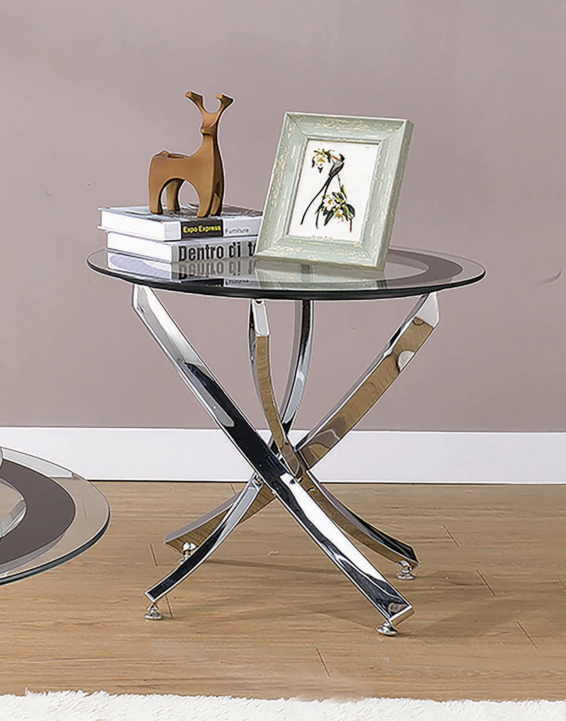 Artfully designed, this end table makes a striking statement. The graceful curves of its base flow together elegantly for a sophisticated look. A chrome finish adds brilliant shine and cool, contemporary appeal. Its top is constructed from tempered glass, accentuated by a bold, black frame around the edge. Whether placed in a den or a foyer, this table creates a decorative display for cherished memories.