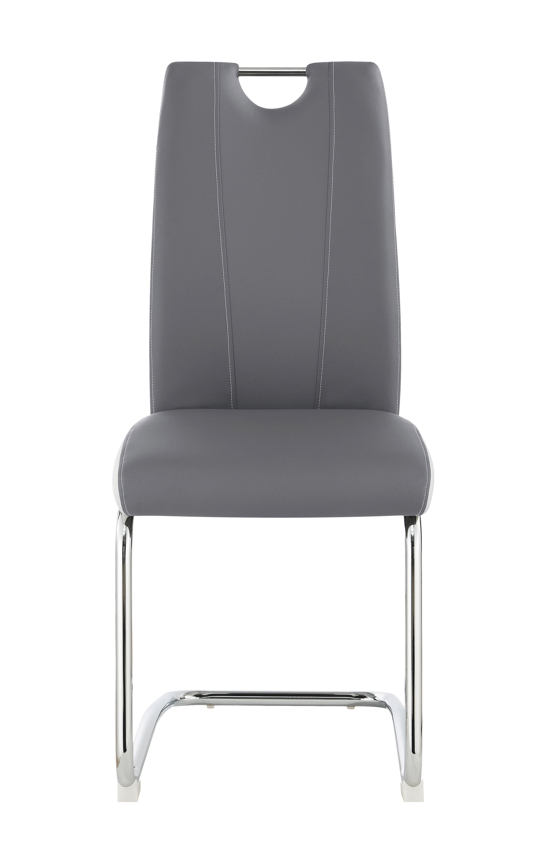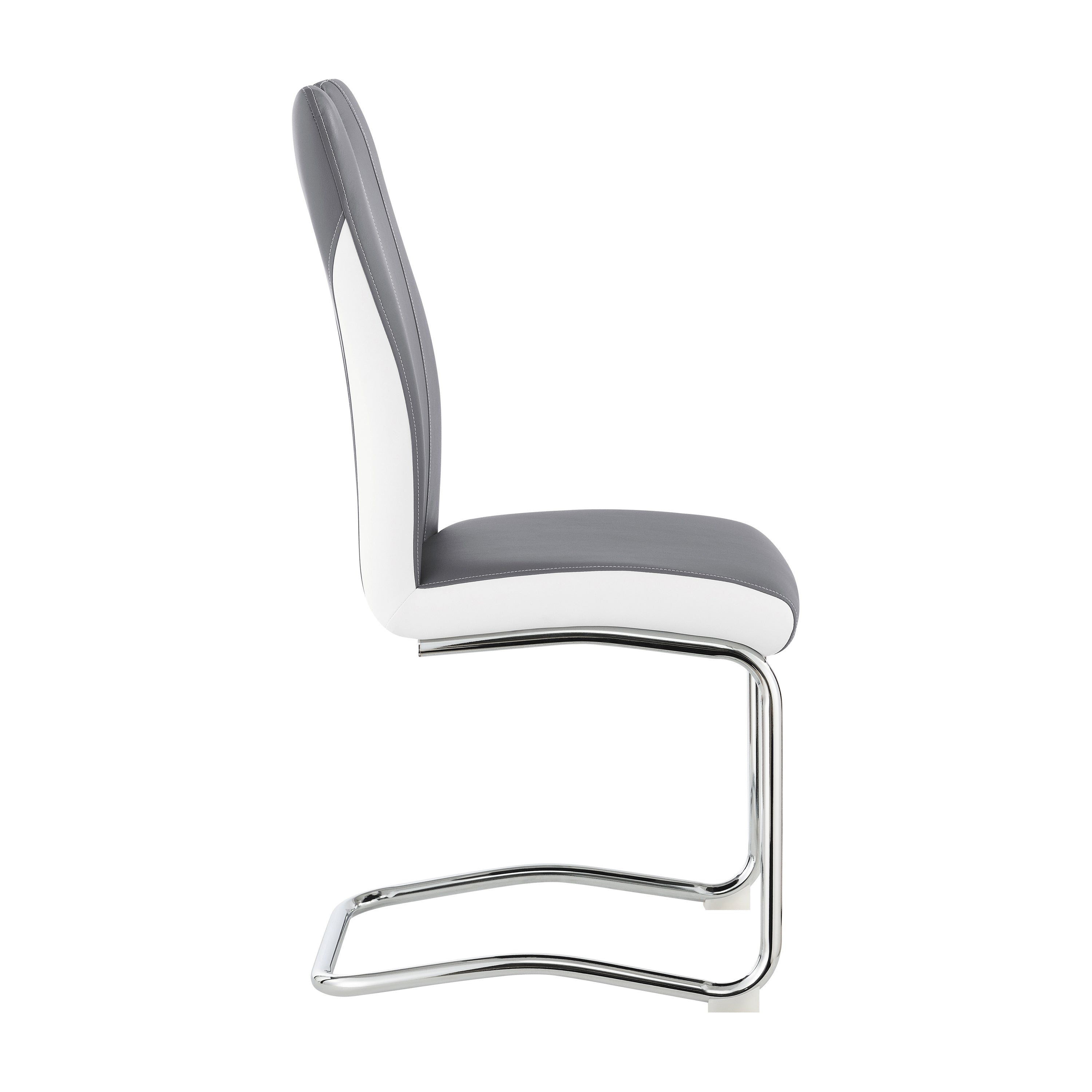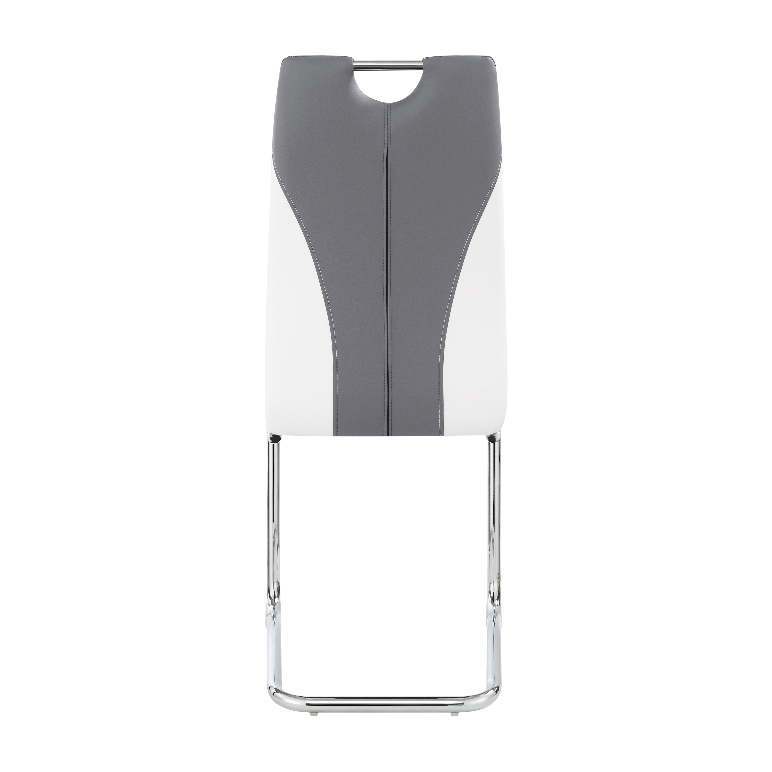 This cantilever style dining chair offers up ultra-modern vibes. Designed with a two-tone upholstered seat, this dining chair features a smooth gray leatherette, outlined and accented in a white leatherette for a contrasted effect. Welt trim along the interior backrest define the contoured silhouette. The cantilever style steel frame and base push retro vibes with a polished chrome finish, mirrored in the handle along the top of the chair. Slide this comfortable dining chair up to a table to create ultra-modern feel.