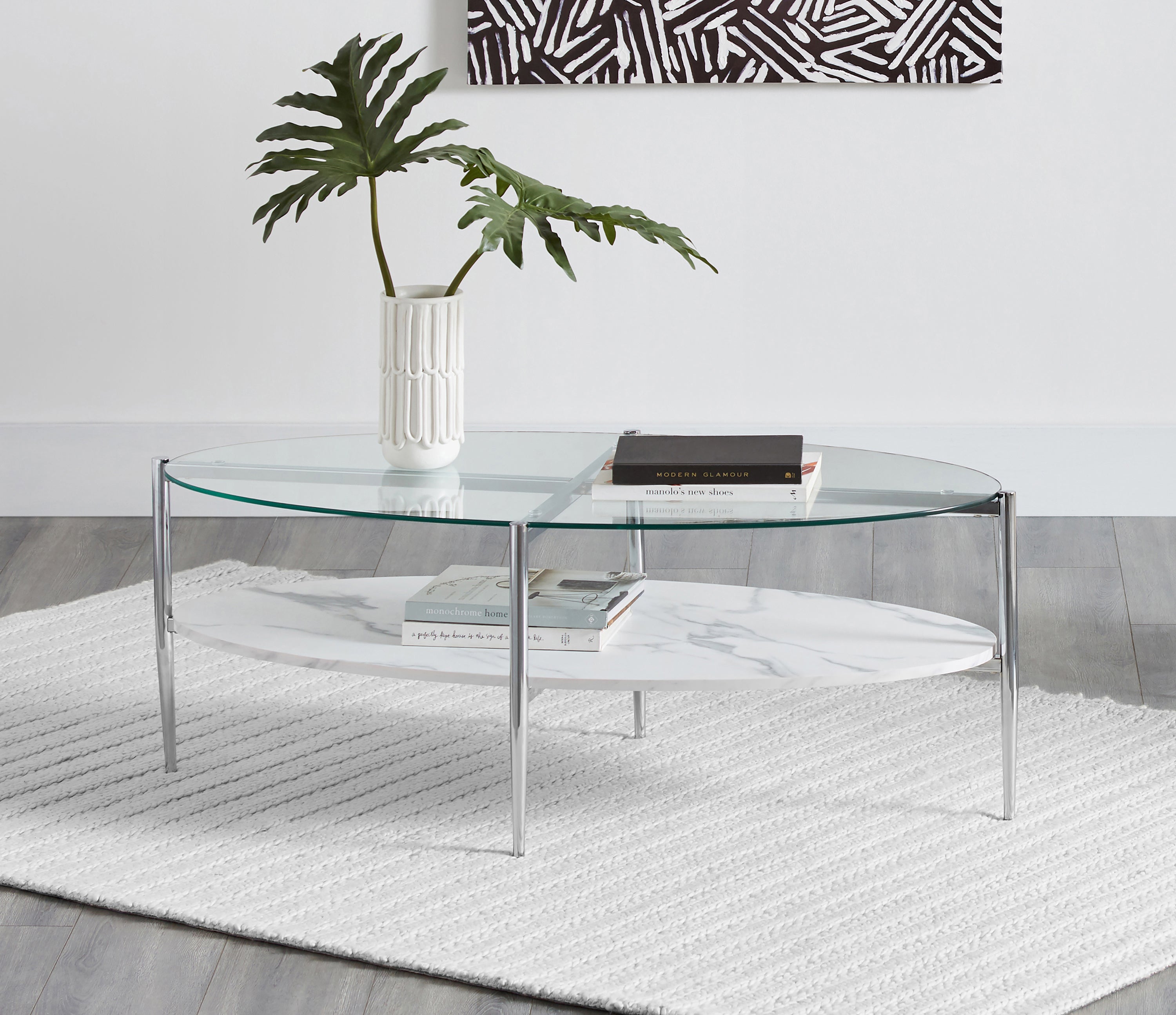 Greet every guest with a gorgeous glass coffee table. The sleek metal base is finished in chrome, giving this piece a wonderful contemporary style. Find a center shelf made from faux marble in hues of white and grey, making this a soothing and airy peace for your space. Decor items perfectly enhance the expansive oval tabletop and bottom shelf. Place this piece in the center of your living space for endless admiration.