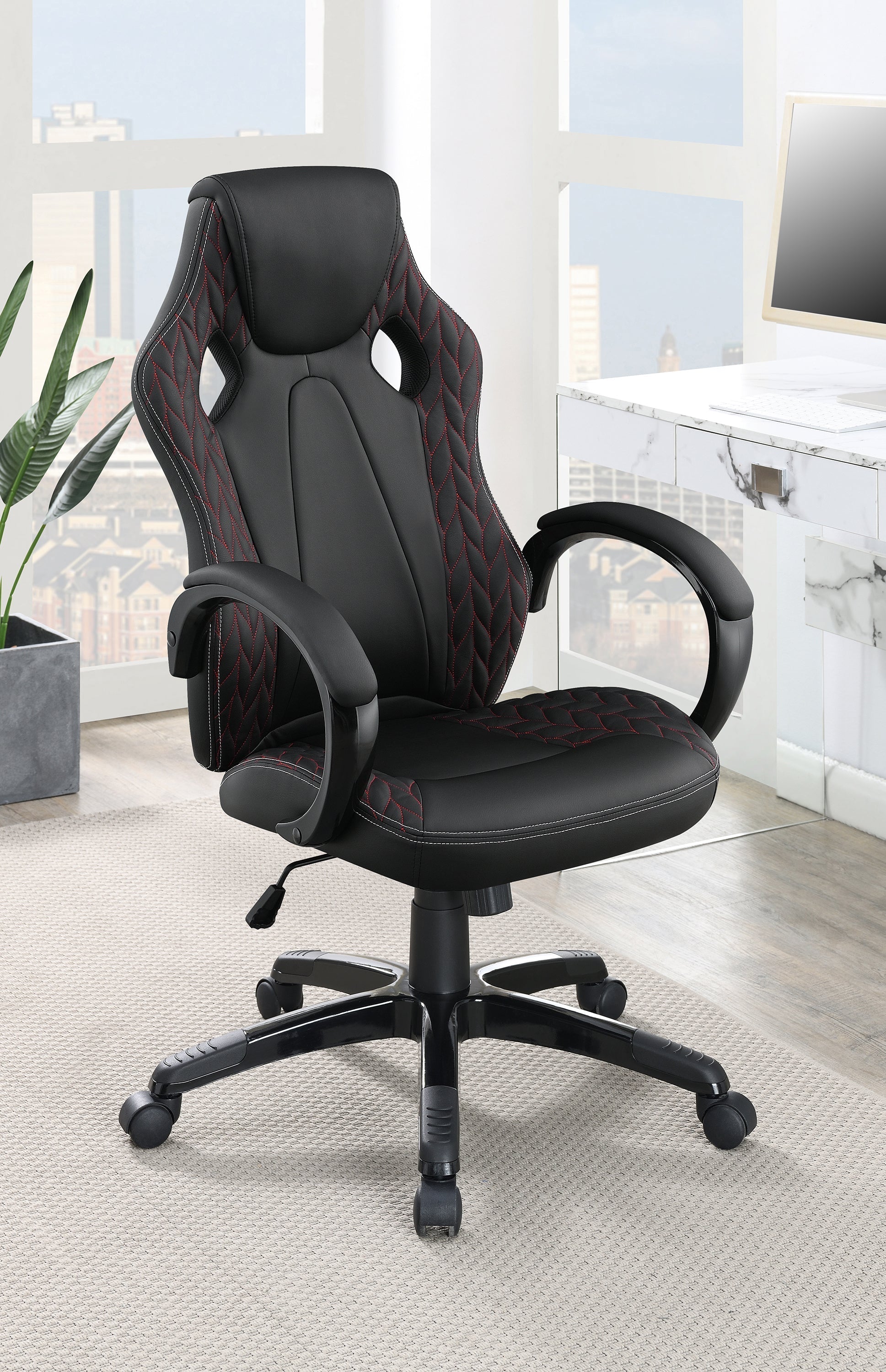 Perfect for a modern home office, this contemporary office chair is wrapped in a black leatherette that offers a bold statement piece. Accenting the black leatherette is a botanical-inspired herringbone pattern with a red stitching details, giving a subtle pop of color. Rounded padded arms provide a place to rest your elbows, while a padded headrest and seat offer long-lasting all-day support. Mounted to a rolling base with five wheels, this mobile office chair easily glides throughout the office space to retrieve items and more. In addition, this office chair can be adjusted, lifted to fit your preferable desk height.