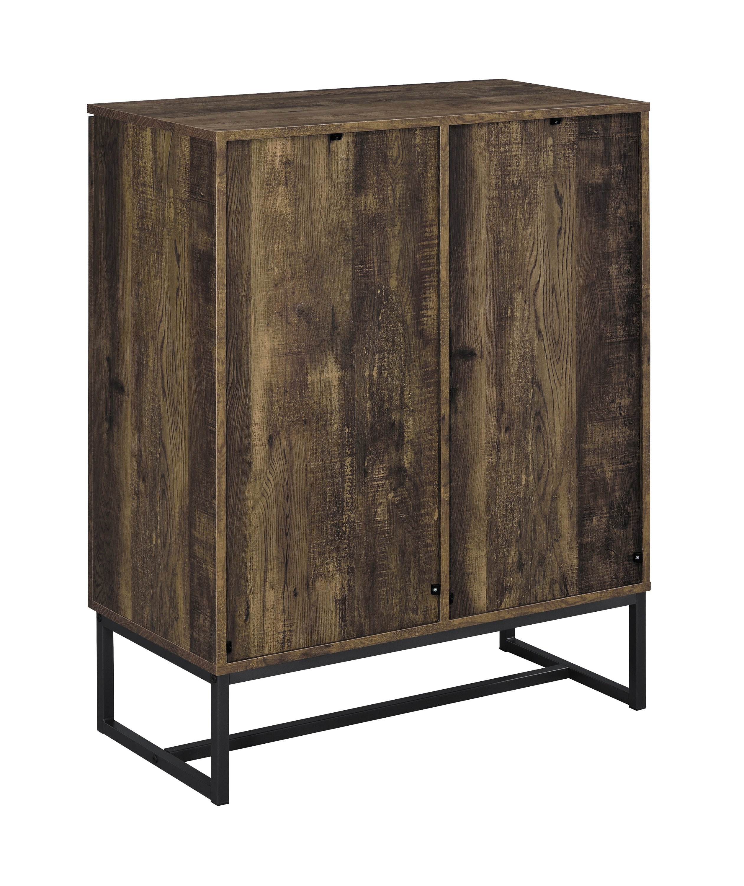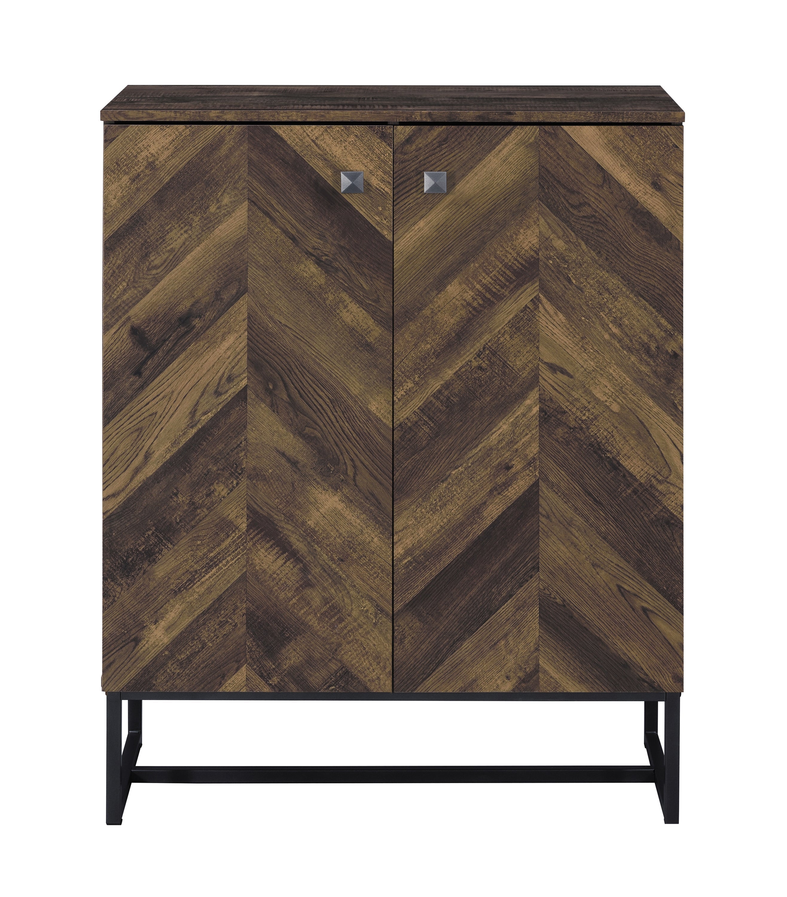A classic herringbone pattern lends a traditional flair to this contemporary accent cabinet. With a rustic oak finish, this charming accent cabinet is a wonderful addition to a modern farmhouse style home. Situated on a sturdy, heavy gauge steel base in a dark gunmetal finish, this accent cabinet is built for heavy items stored inside. Tucked behind dual cabinet doors are four storage compartments where you can organize and hide all your dining room or living room essentials from platters to board games and media. In addition, square knobs give a minimal hardware accent to each of the cabinet doors.