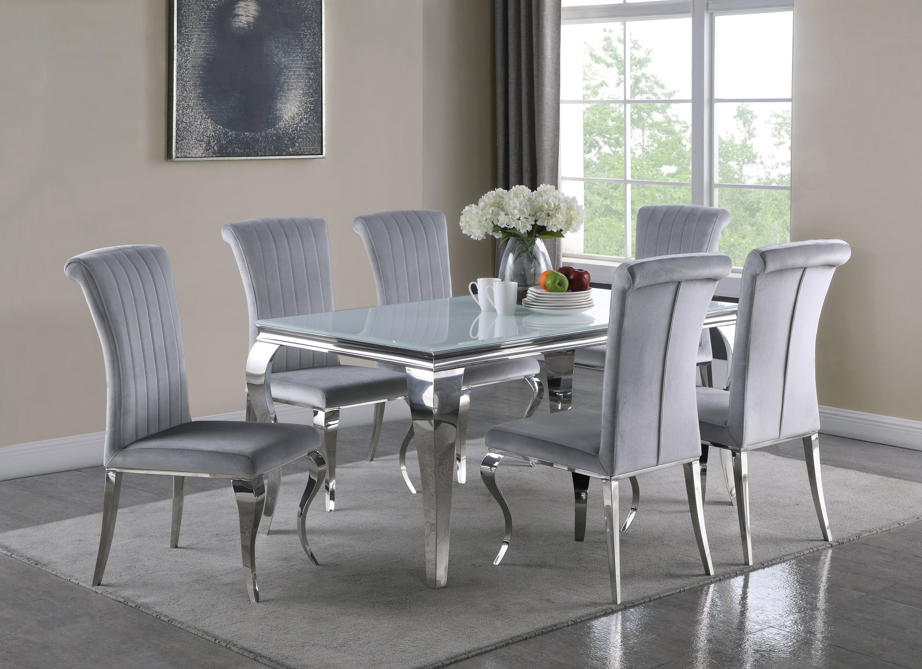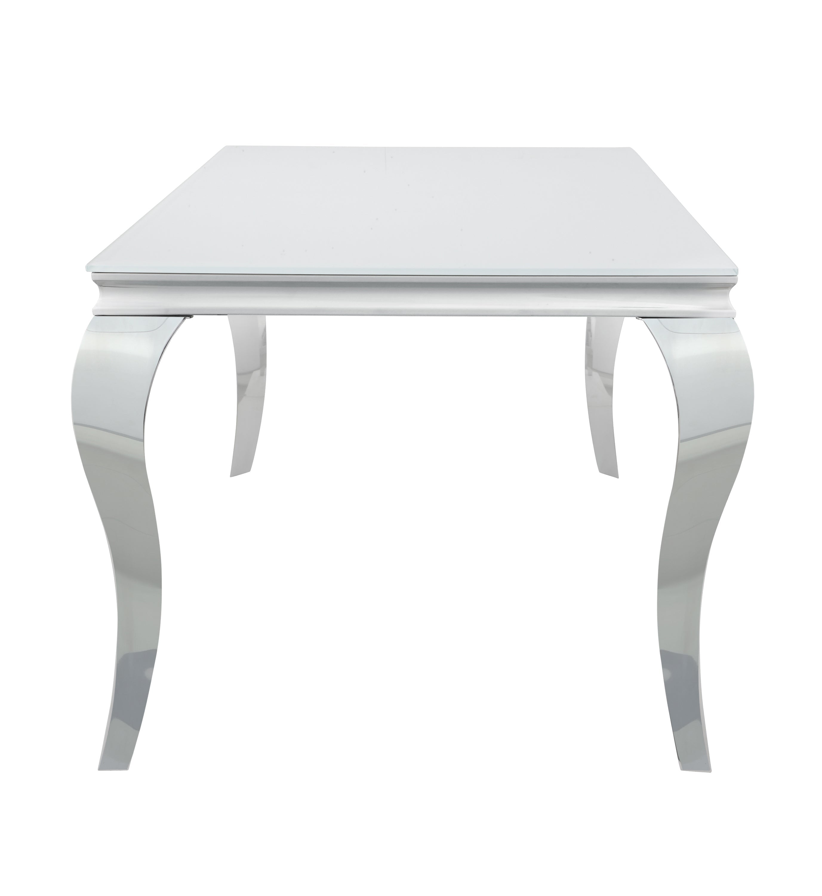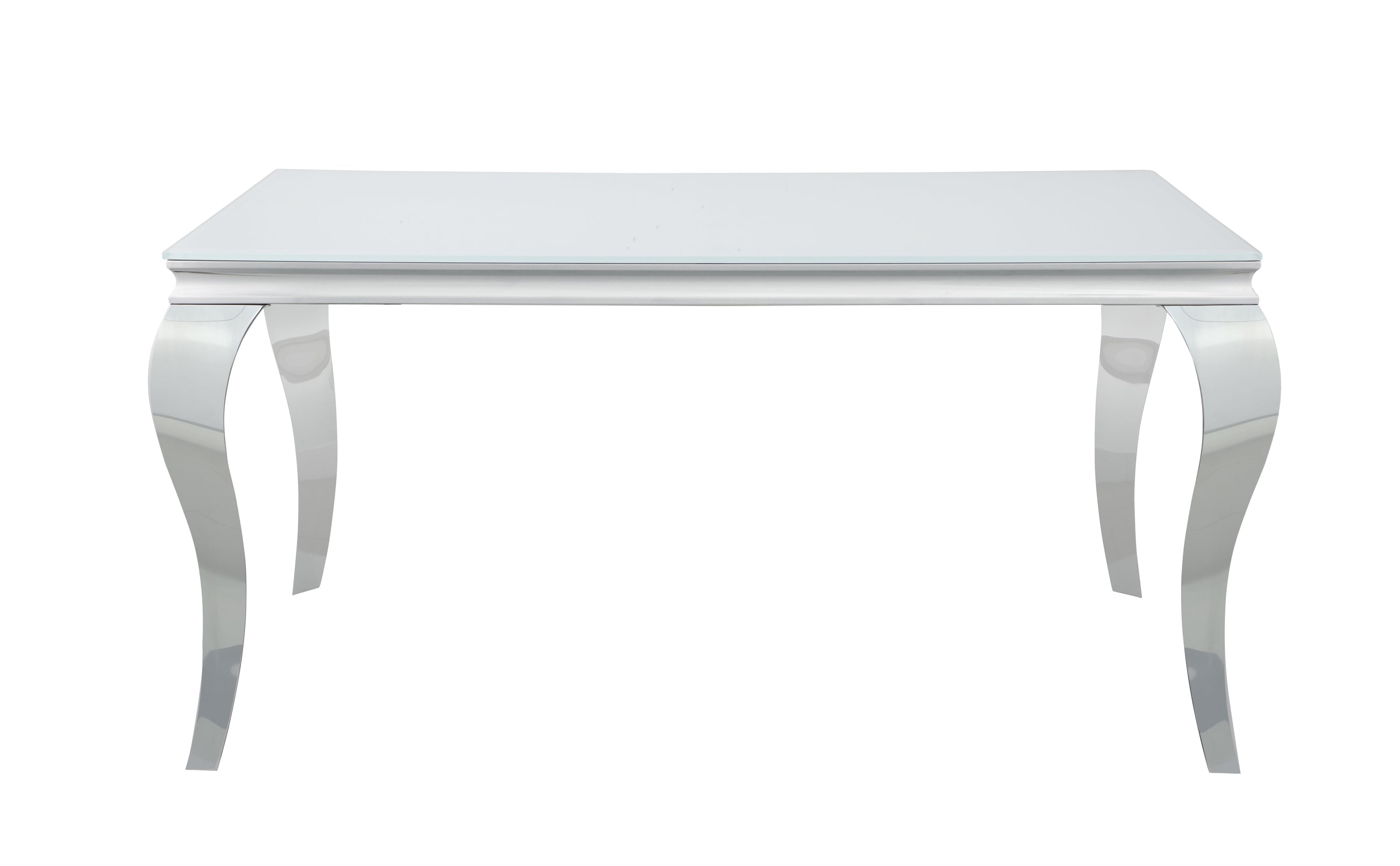 Elegant with a touch of glamorous, this dining table adds a wonderful statement piece to a more formal dining room. Made with mixed materials of durable stainless steel and glass, this dining table features lends itself to a variety of color palettes. A polished and gleaming chrome finish on the table base, complete with classic Cabriole legs, lend a traditional flair to a contemporary style. Gather around and get your plates on the opaque white tempered glass tabletop. In addition, this dining table seats six people comfortably.
