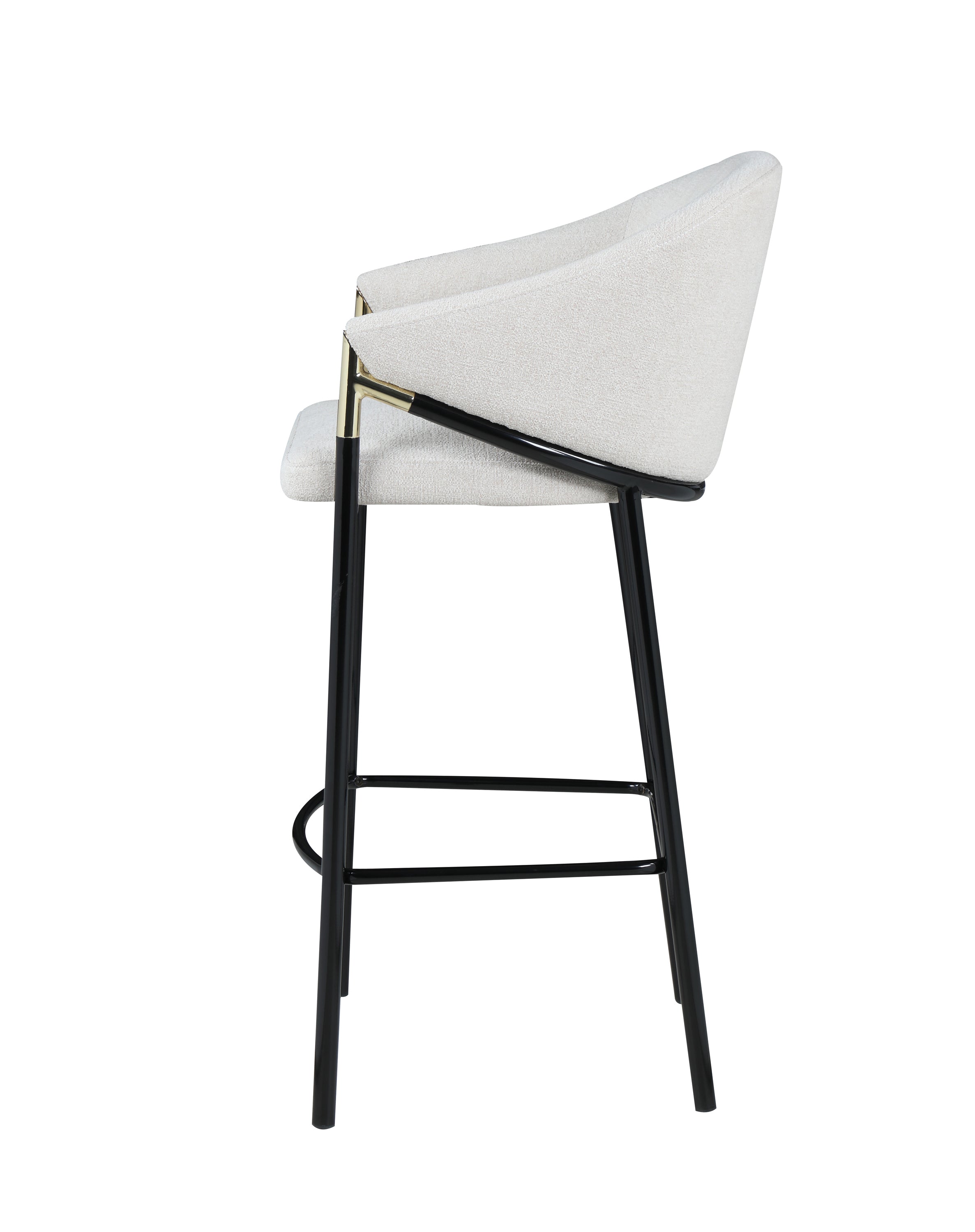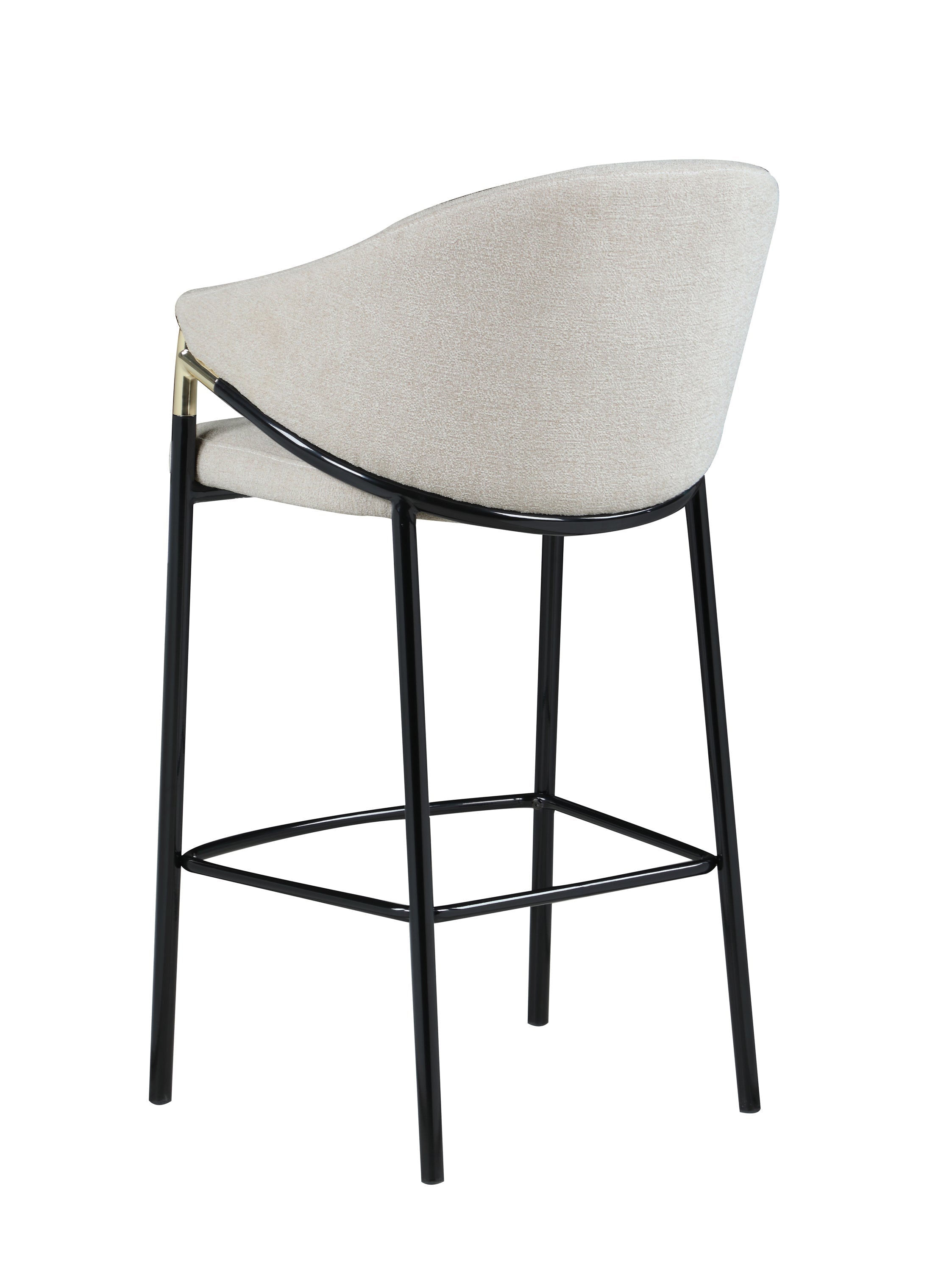 This pair of two stools offer a Hollywood regency look. With a tall and sleek design, the legs come in a glossy black finish that lends to many color palettes and offers a handsome look. Each stool has a cushioned seat, wrapped in a linen-like fabric that is soft to the touch. Plus, lean back and relax between sloped arm rests and a curved high back as you sip cocktails and chat with guests. Capping each arm rest is a gold accented piece that adds a glamorous touch.