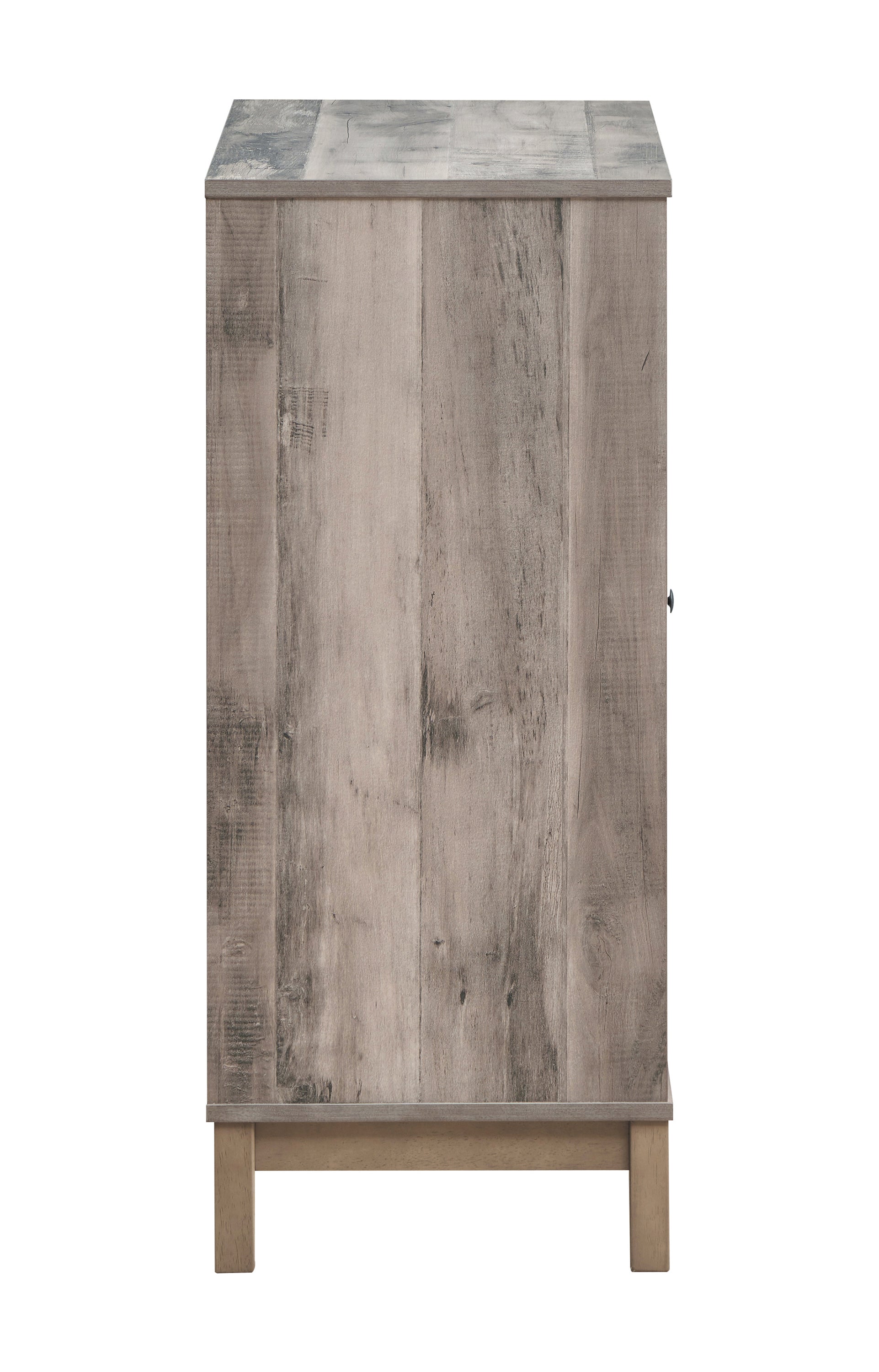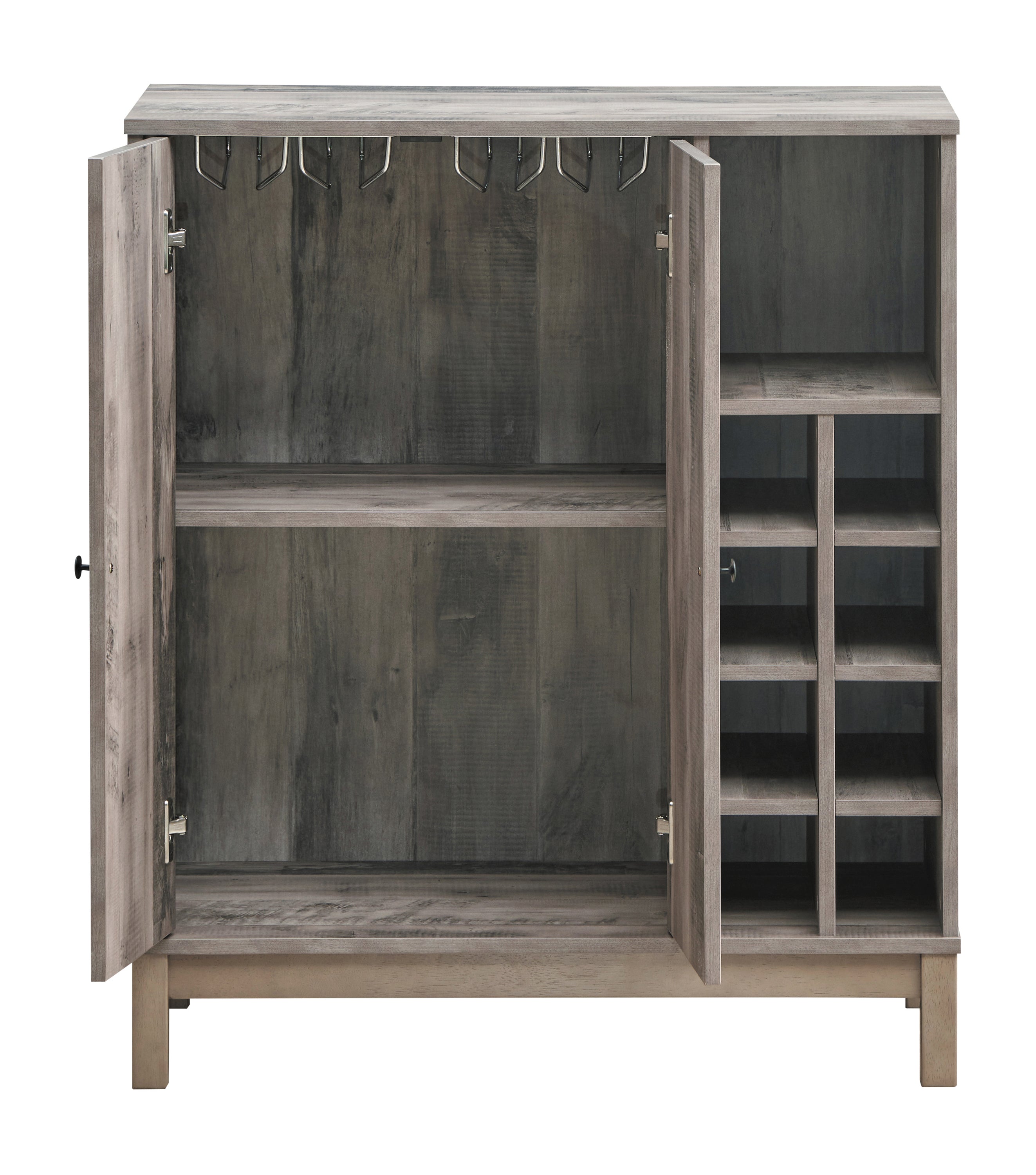 Perfect for compact homes comes this rustic wine cabinet. With a weathered Acacia wood-like finish over the frame, this wine cabinet lends itself to modern farmhouse style living rooms and dining rooms. On the right side are eight wine bottle storage cubbies, along with an open space for storing extra wine accessories. On the left side is a double-door cabinet that hides away all your items neatly inside, with the help of four stemware racks and two open shelves. Each cabinet door also features a matte black round pull that lends a modern flair.