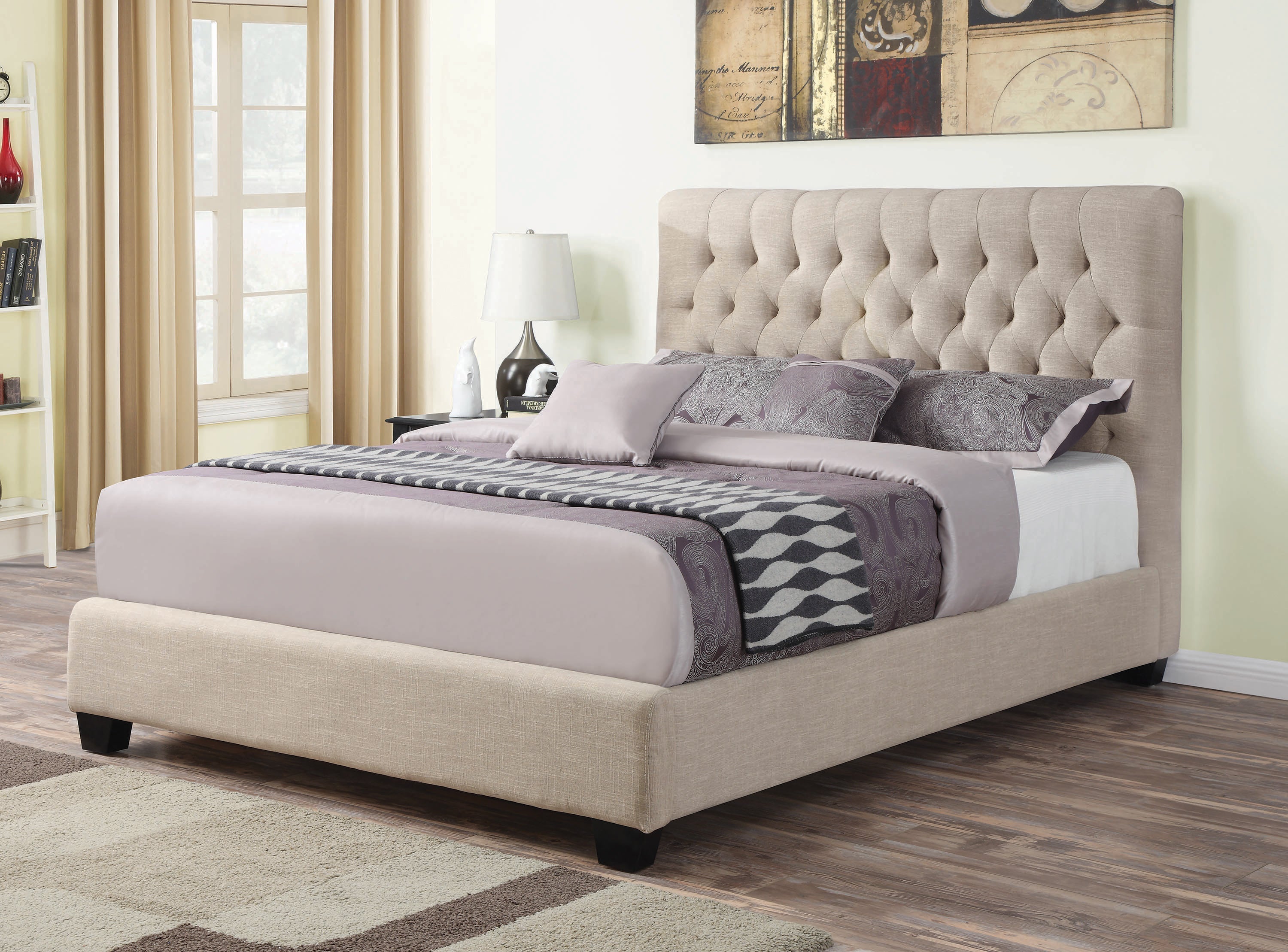 This low-slung bed combines elegant styling with a simple design that's a gorgeous addition to the home. The high headboard has crisp lines and is beautifully accented with button tufting. No footboard gives this bed an open, appealing quality. The bed sit on short espresso legs that are a handsome complement to the bed design. This bed brings an understated timeless design to the bedroom.