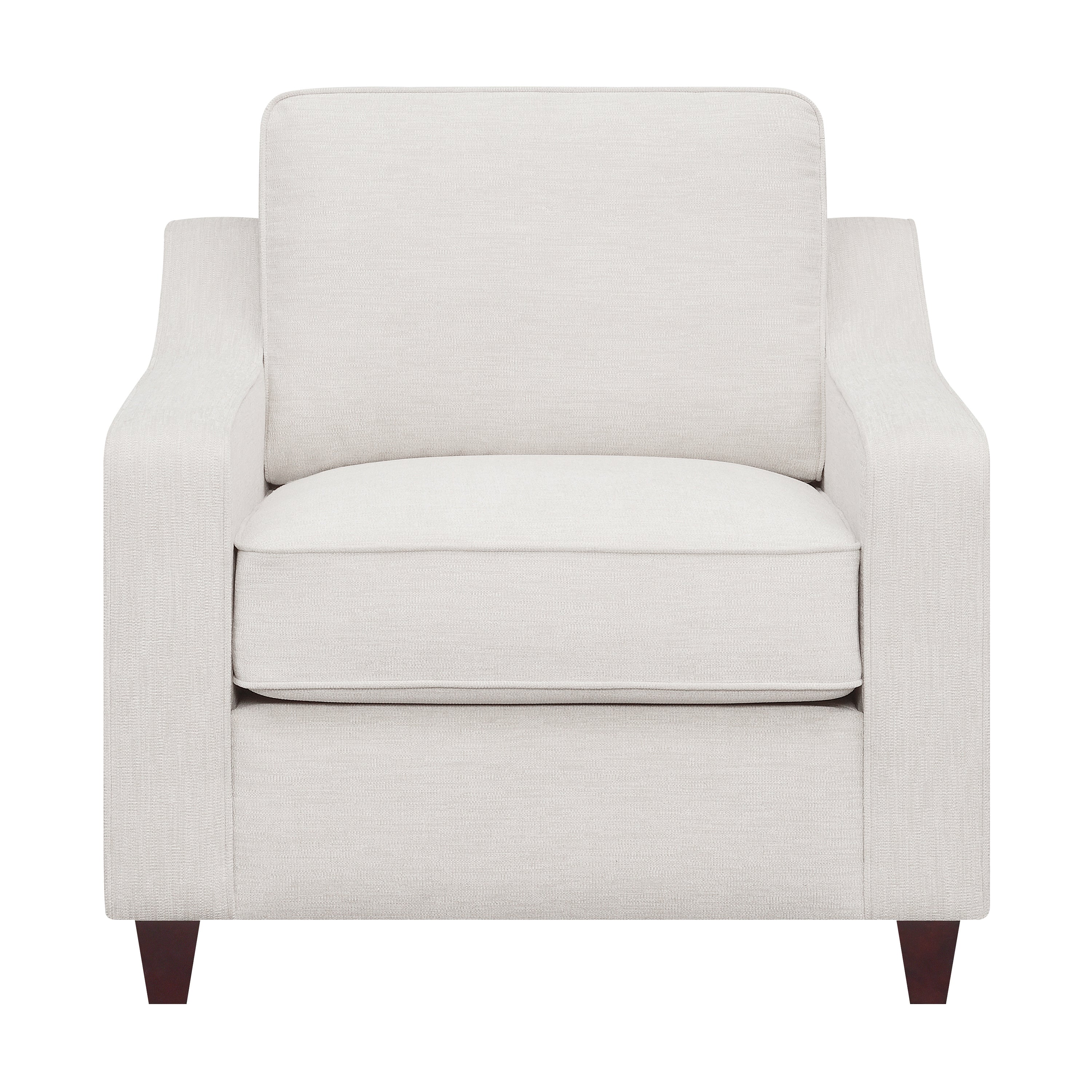 Wrapped in a cheerful, beige woven chenille upholstery, this seating set exudes a look of sophistication. Sloped track arms add elegant lines while tapered dark brown legs add a striking contrast. Understated yet regal, this transitional seating set works inside farmhouse and contemporary style homes effortlessly. Dense and plush boxed seat and back cushions feature classic welt details, as coral and copper tone accent pillows lend a boho-like tough. Add this upholstered furniture set into a space for a subtle chic aesthetic.